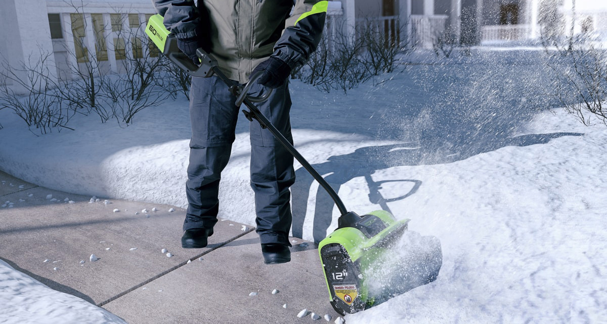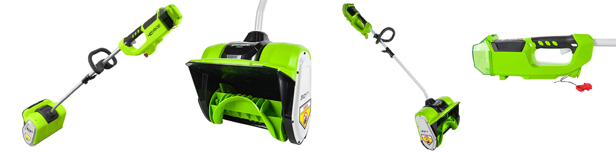 Среди снегоуборочных лопат Greenworks выделяется модель GD60SS 60V с мотором бесщеточного типа. Она идеально подходит для уборки снега на небольших территориях и придворовых участков. Лопата захватывает снег на 30 см шириной и 15 см высотой. Отбрасывает его на расстояние — 6 метров. Напряжение аккумулятора в 60V позволяет выдавать мощностные показатели, достаточные для того, чтобы справиться с достаточно плотным настом.