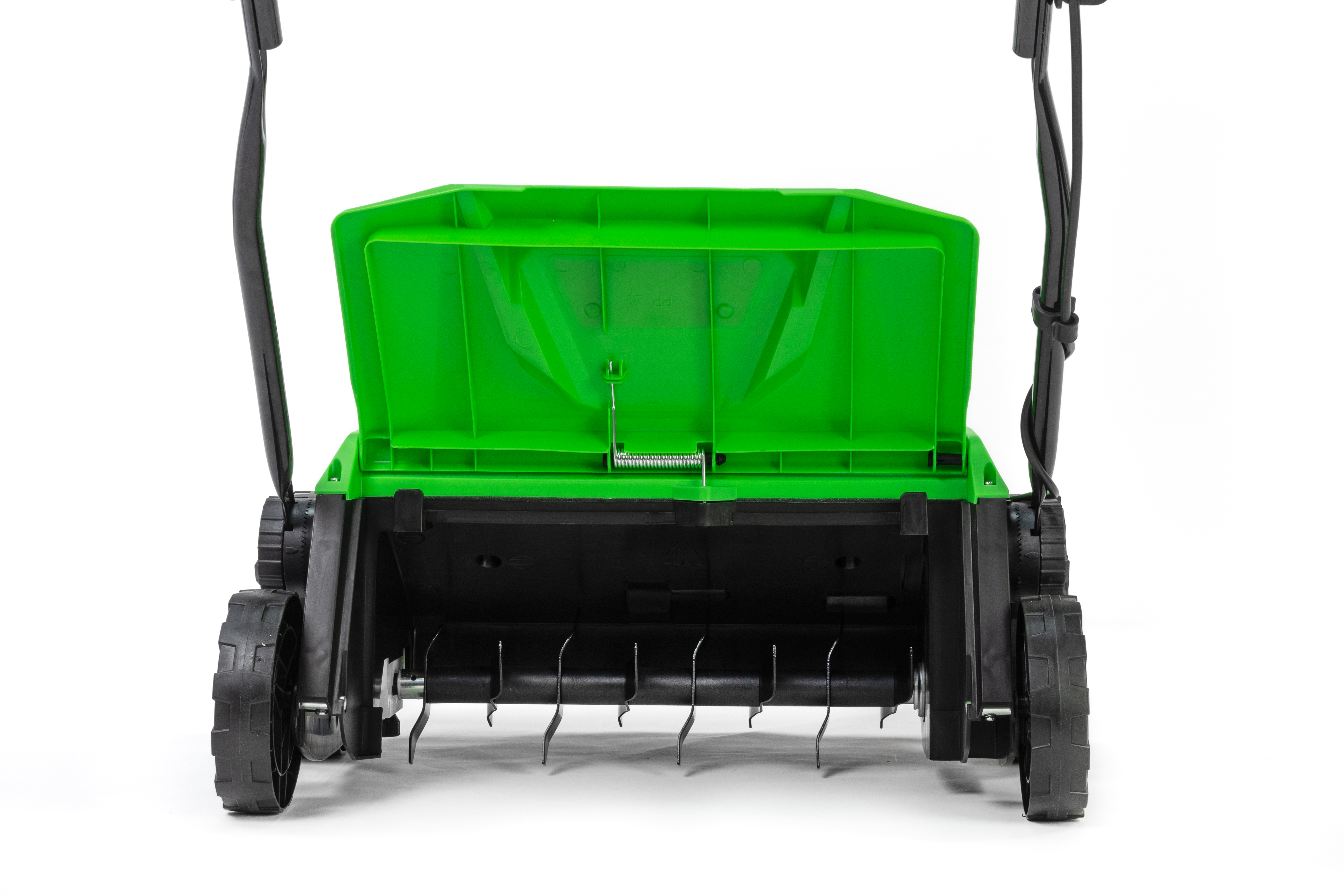 Модель оснащена просторным травосборником 45 л. Такой объем позволяет реже отвлекаться от работы на то, чтобы останавливаться и опустошать травосборник. Запускается аэратор-скарификатор очень просто: нужно нажать всего лишь одну кнопку. А компактные размеры и малый вес 12 кг обеспечивают высокую маневренность.