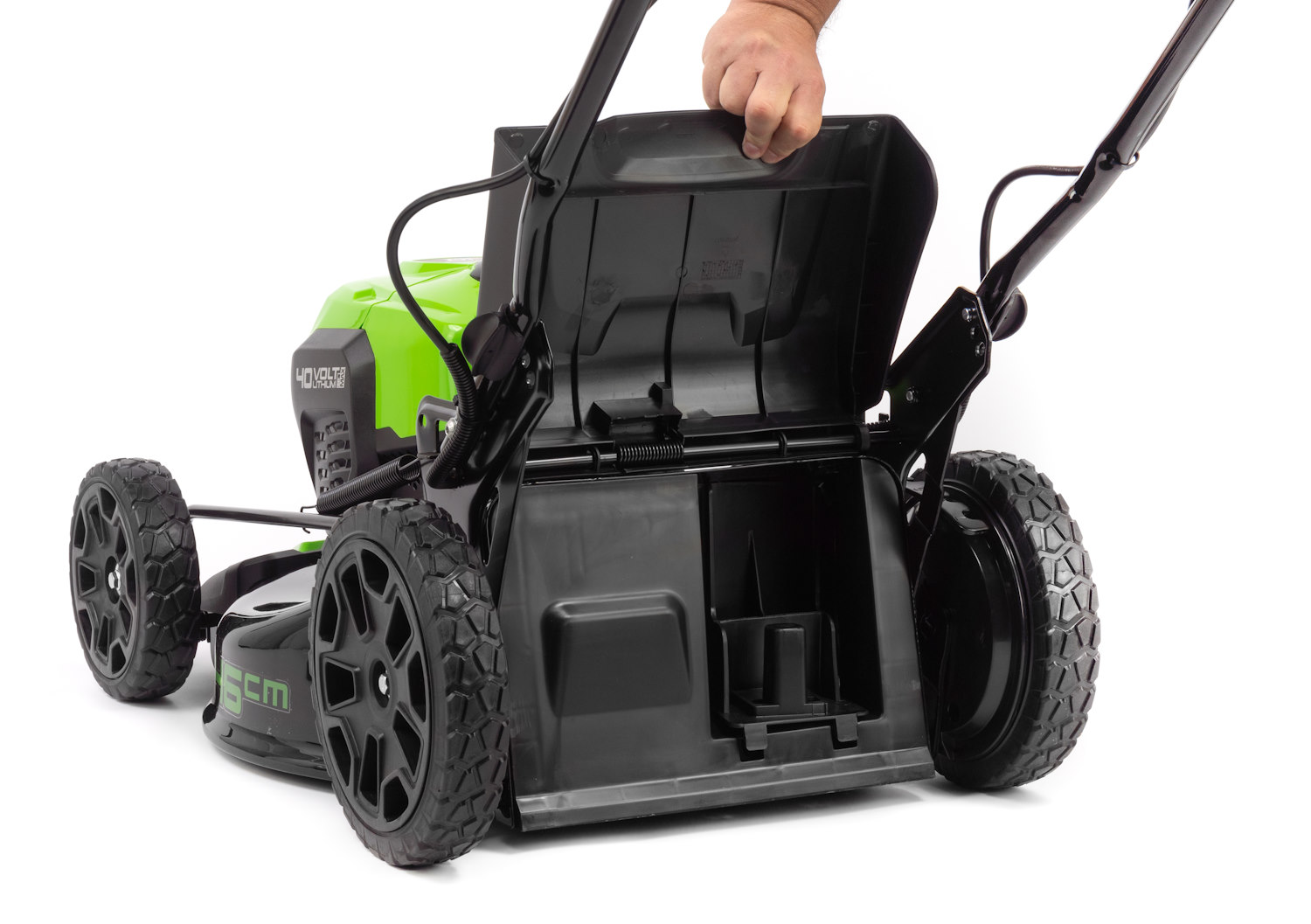 GD40LM46SP имеет ширину скашивания 46 см — достаточно большую, чтобы обработать площадь до 750 м2 на одной зарядке благодаря двум слотам для батареек и достаточно маленькую, чтобы хранить на складе с другими инструментами. Данная модель оснащена функцией 3-в-1: мульчирование, задний сбор травы и боковой выброс. Травосборник имеет объём 55 литров, что дает вам больше времени для кошения и сокращает время на высвобождение контейнера от травы. Благодаря семи положениям высоты кошения приятно работать даже в самом сложном саду.