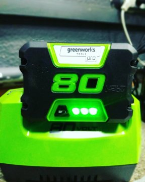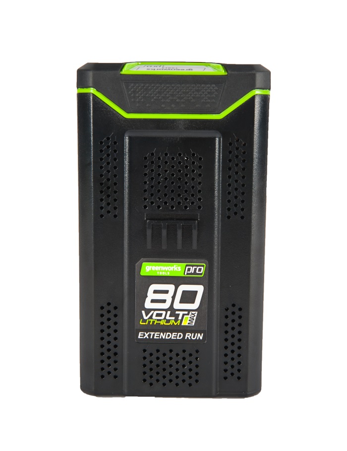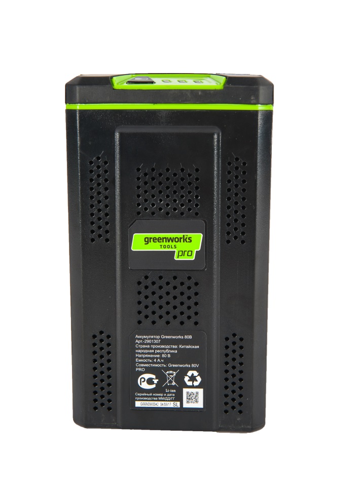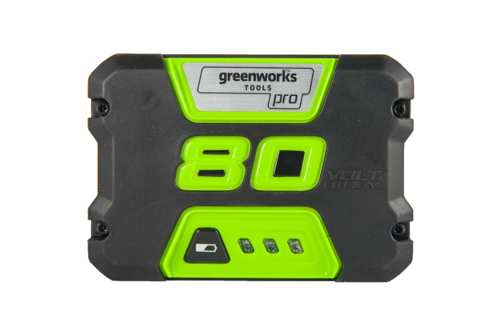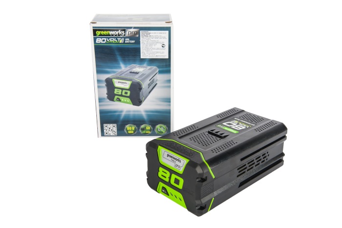 Аккумулятор GreenWorks 80 вольт (модель G80B4) — это литий ионная (Li-ion) батарея, силой тока 4 ампер/час и выполненная по самой современной технологи.