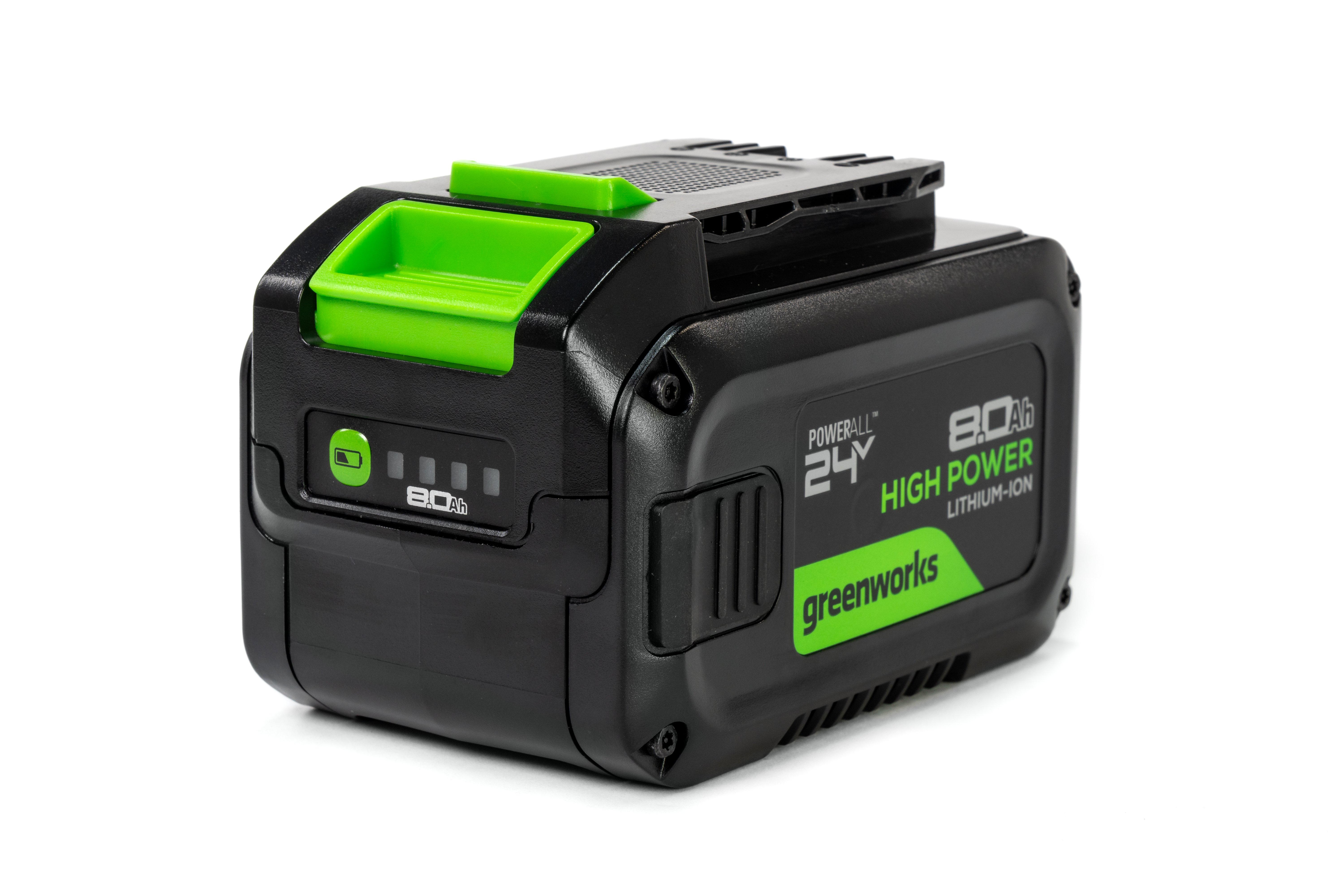 Новое поколение аккумуляторных батарей Greenworks High Power 24V с высокой отдаваемой мощностью и долгим сроком службы. G24HP8 - универсальная аккумуляторная батарея ёмкостью 8 Ач предназначена для самых мощных и требовательных к отдаваемой мощности и к запасу энергии инструментов платформы Greenworks POWERALL 24V. Высочайшая номинальная мощность батареи G24HP8 позволяет увеличить производительность особенно мощных устройств платформы POWERALL 24V. Новый уникальный, прочный корпус обеспечивает эффективное охлаждение во время зарядки, защиту всех компонентов батареи, а также имеет легко узнаваемый, современный внешний вид.