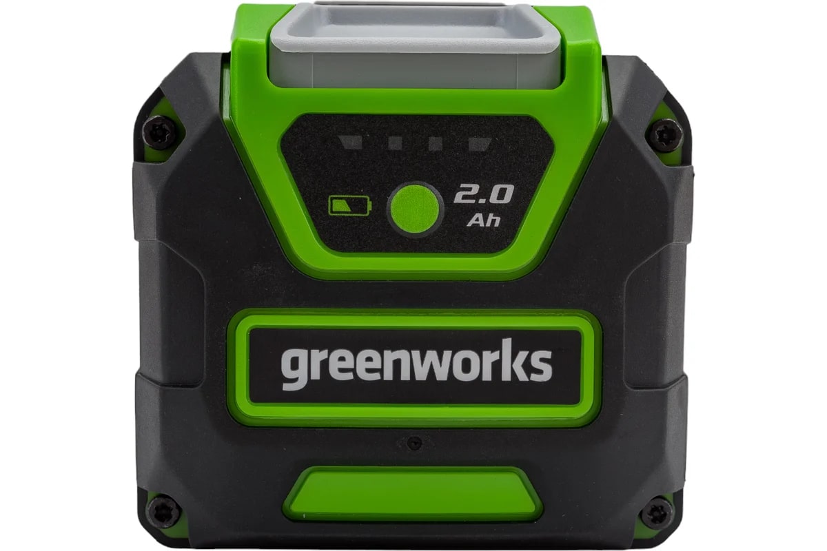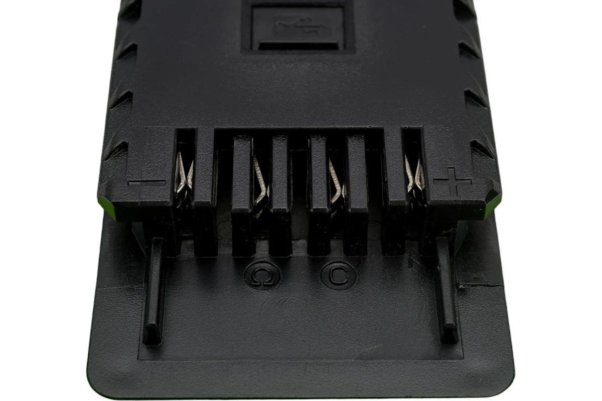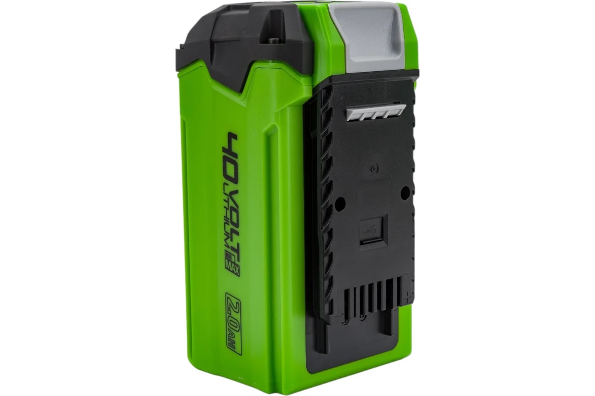 Аккумулятор 40V GREENWORKS G40USB2 2 А.ч - состоит из нескольких ячеек высокого класса - А++. Ячейки управляются специальной платой с встроенным контроллером, благодаря которой ячейки заряжаются и разряжаются равномерно и одновременно, а также установлен чип для защиты от перегрева/перезаряда и глубокого разряда. Это увеличивает срок эксплуатации аккумулятора (до 2000 циклов), время работы устройства от аккумулятора (на 20%), а при постепенном разряжении батареи во время работы инструмент не теряет своей мощности. Аккумулятор имеет USB-разъем с помощью которого его можно использовать в качестве зарядного устройства.