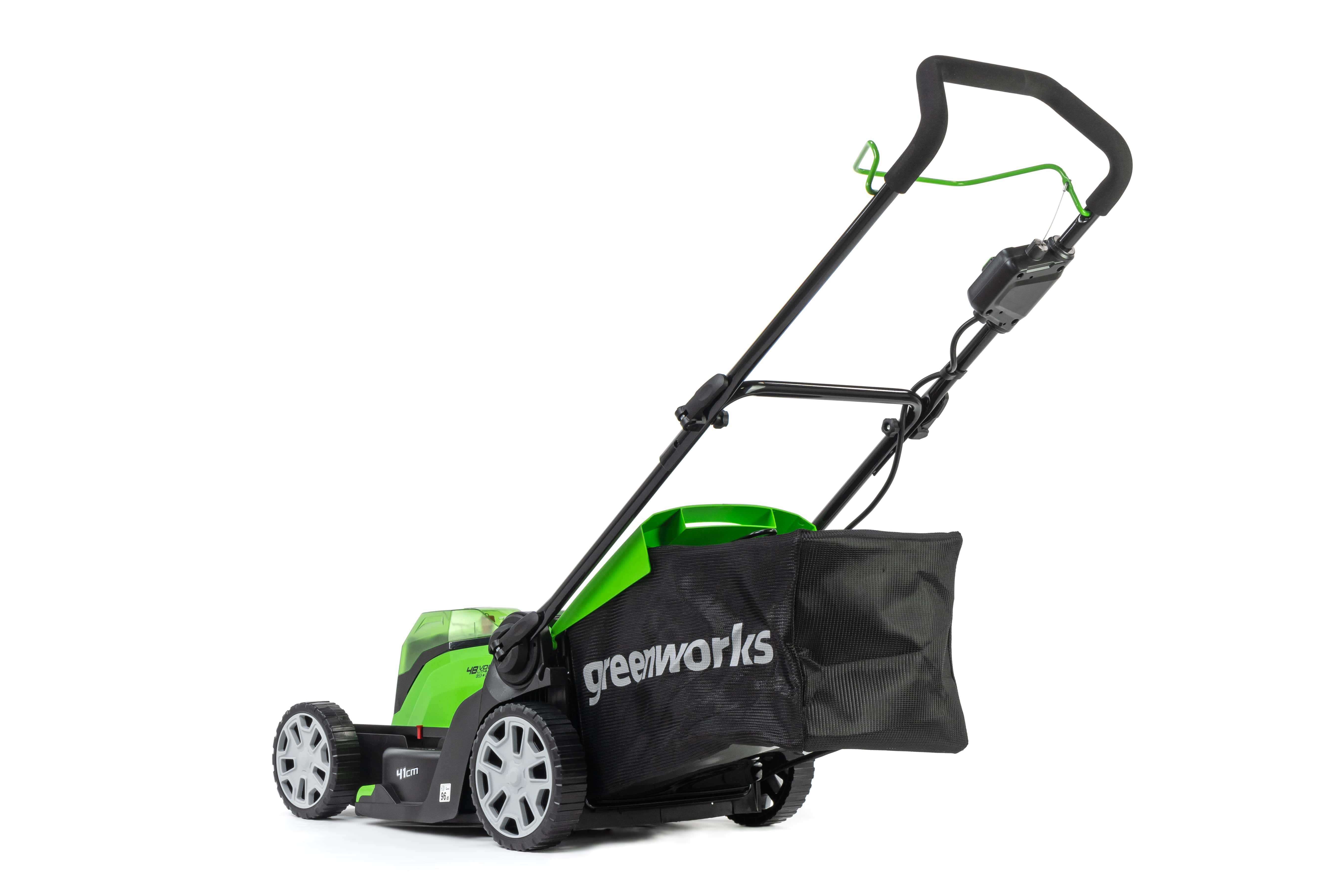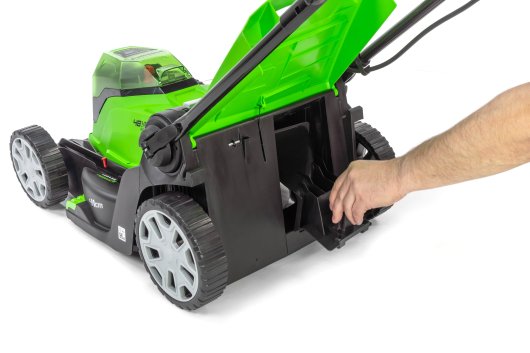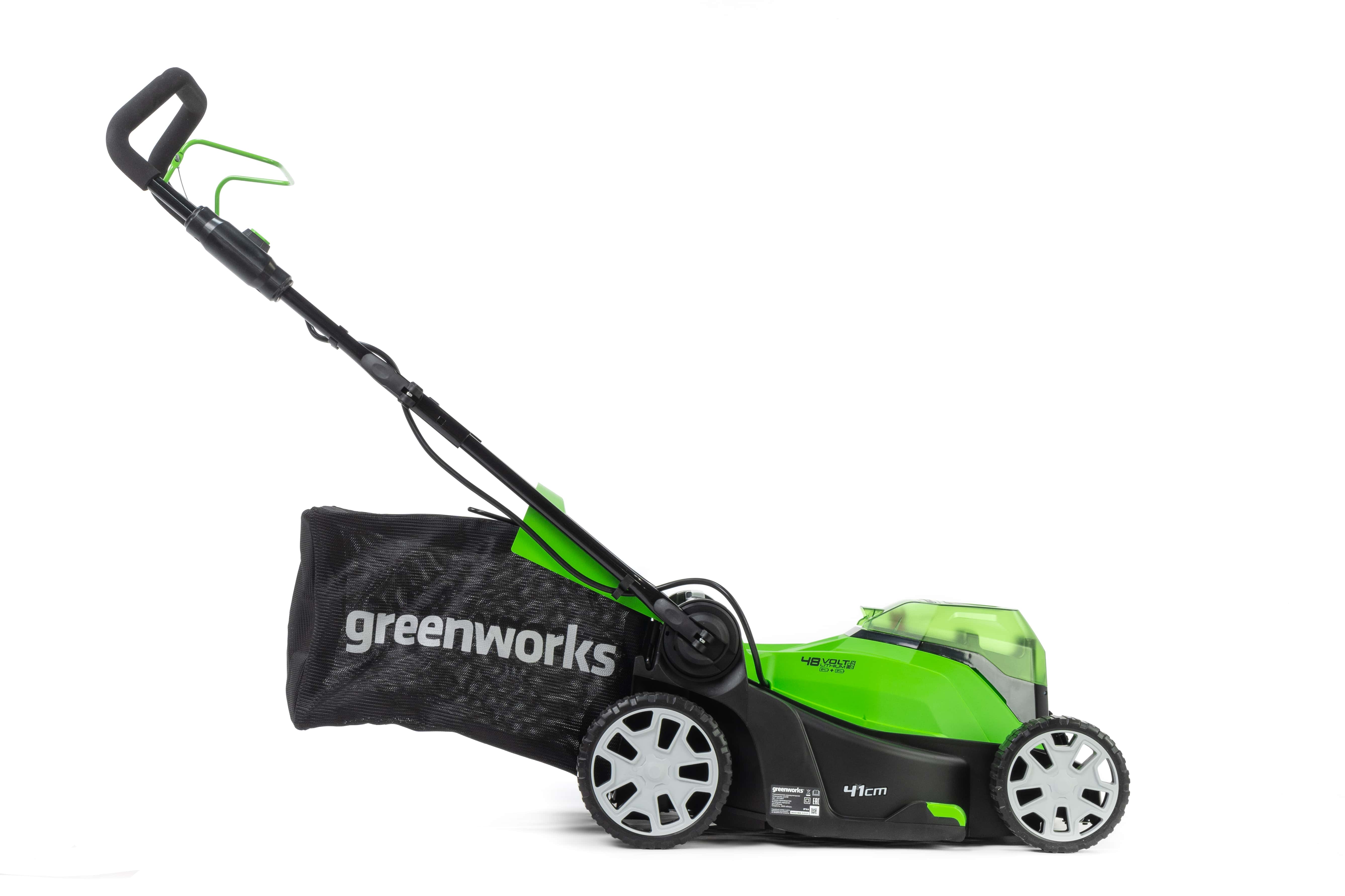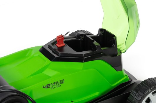 Газонокосилка имеет усовершенствованную систему и питается от двух аккумуляторов 24V, что дает выходное напряжение 48V. Благодаря этому скорость холостого хода составляет 3 600 об/мин. Ширина среза — 41 см, вес устройства без аккумуляторов всего 18 кг. Высоту среза можно регулировать от 25 до 80 мм. Все это позволяет легко и быстро обрабатывать небольшие территории.