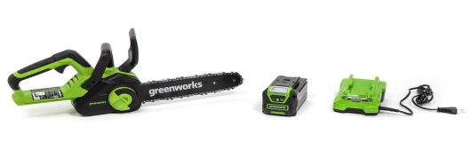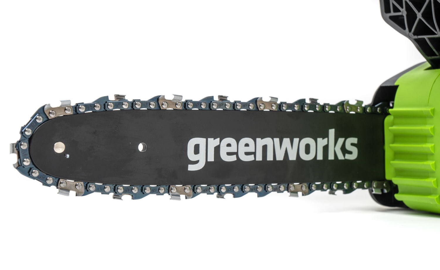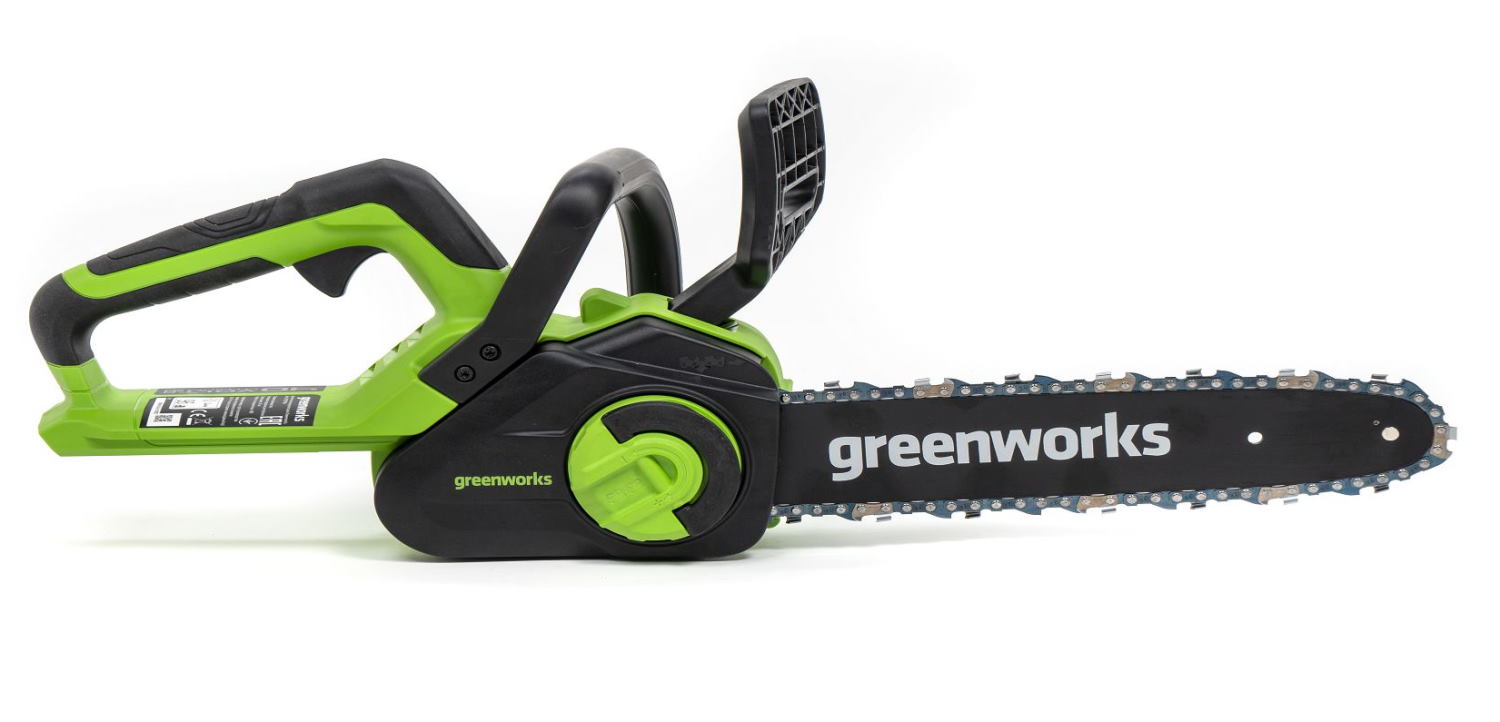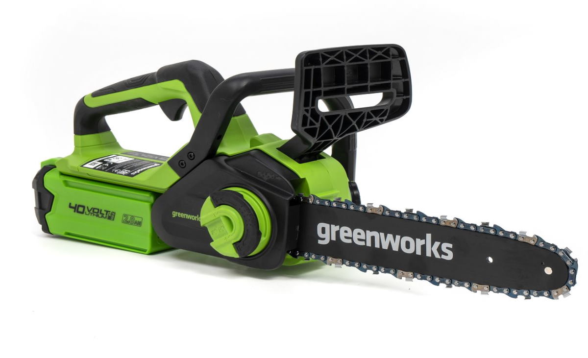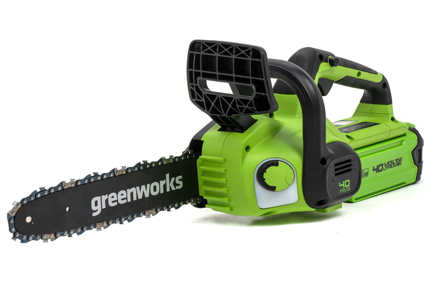 Аккумуляторная цепная пила Greenworks G40CS30II 40V — компактная и легкая пила весом 2.74 кг для несложных задач на участке: подрезка толстых веток, кустарников, небольших деревьев.
