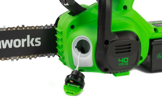 Аккумуляторная цепная пила Greenworks G40CS30II 40V — компактная и легкая пила весом 2.74 кг для несложных задач на участке: подрезка толстых веток, кустарников, небольших деревьев.