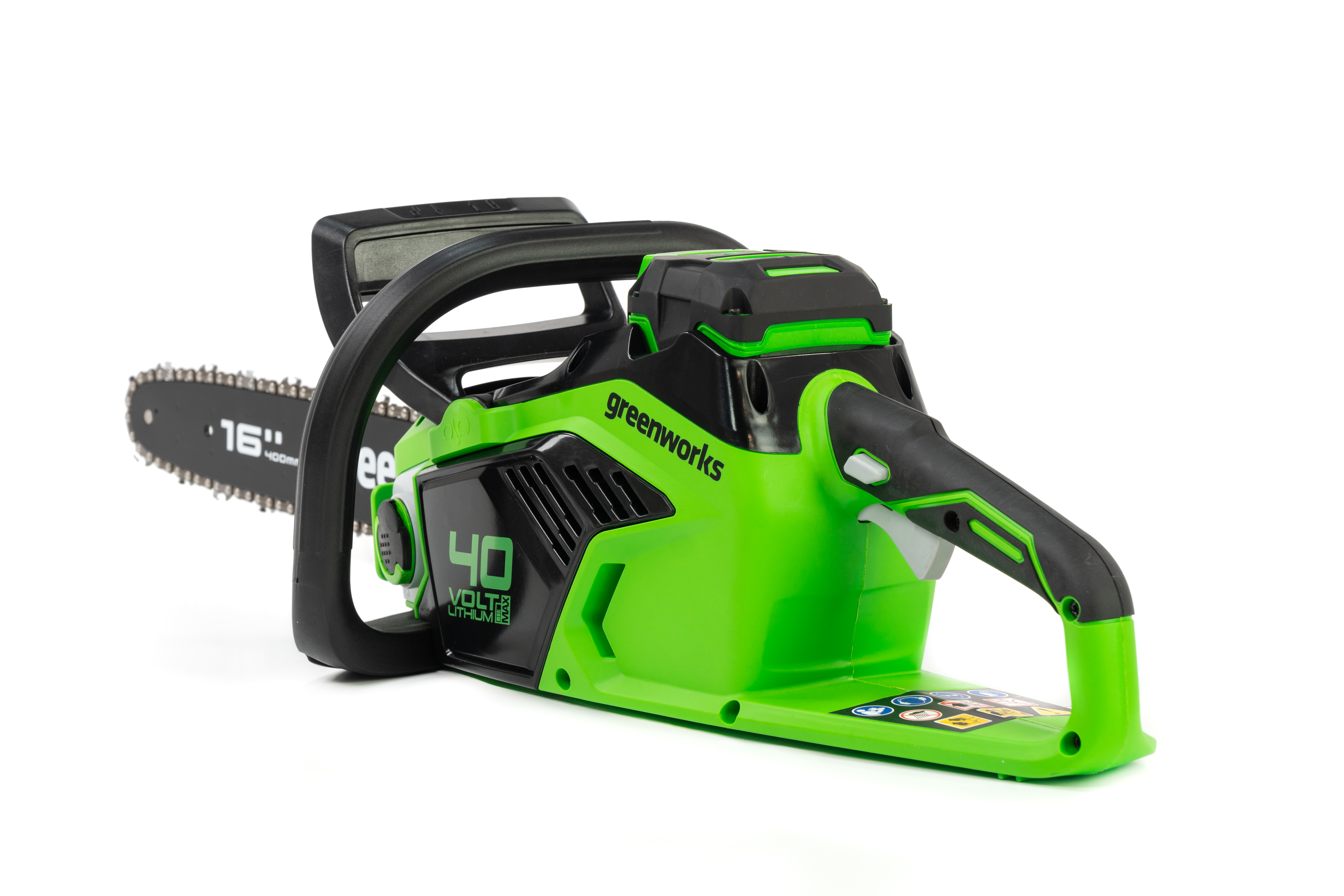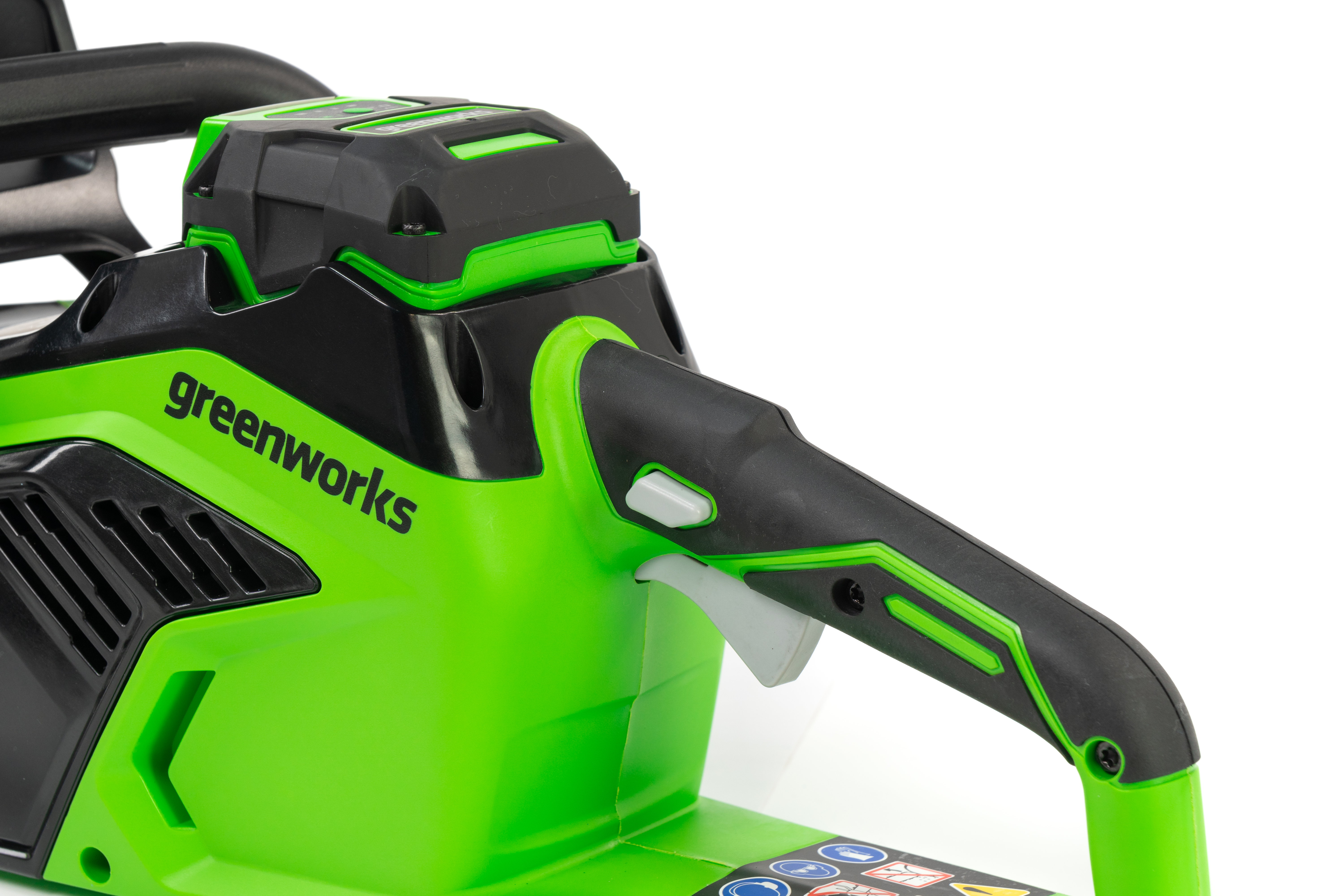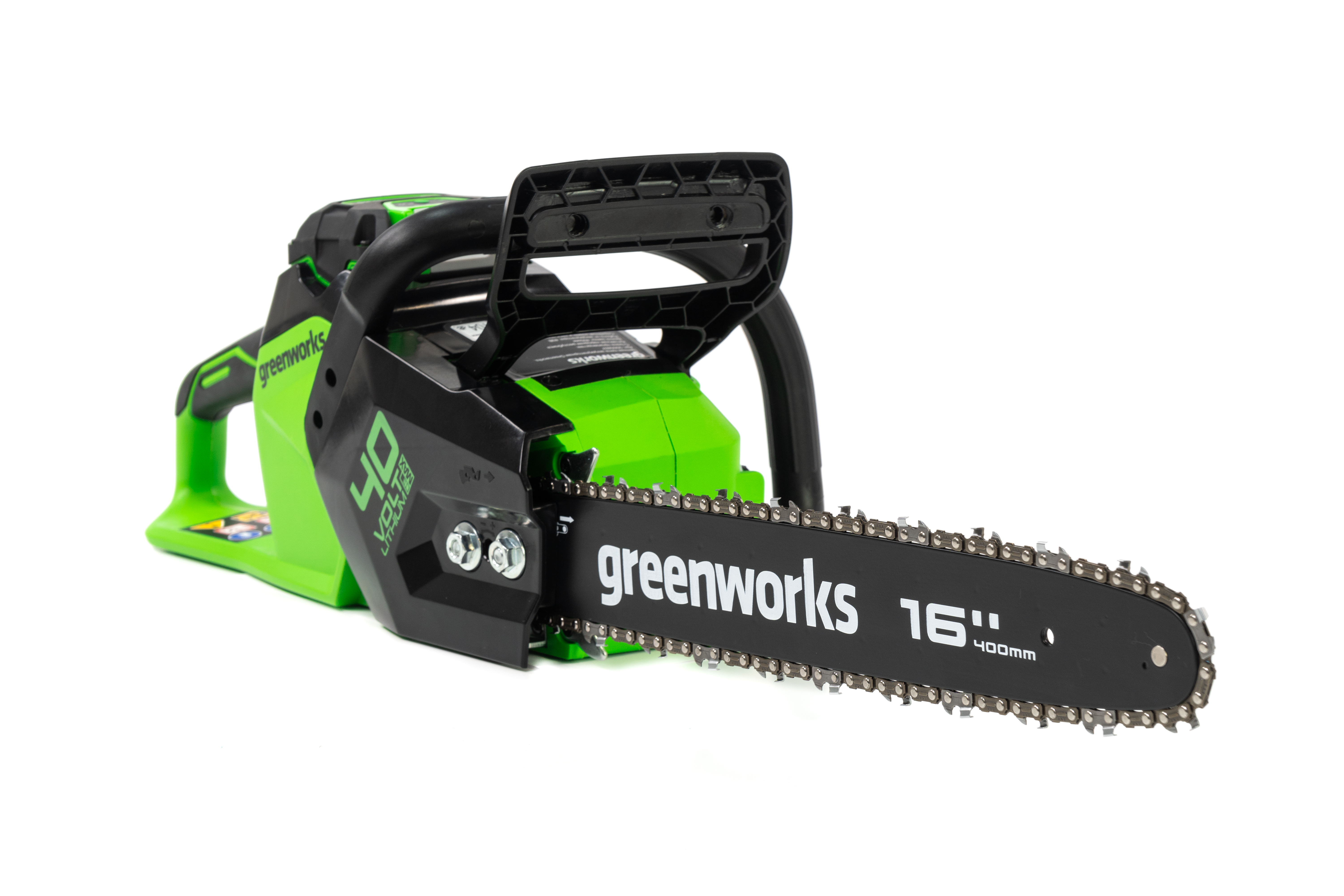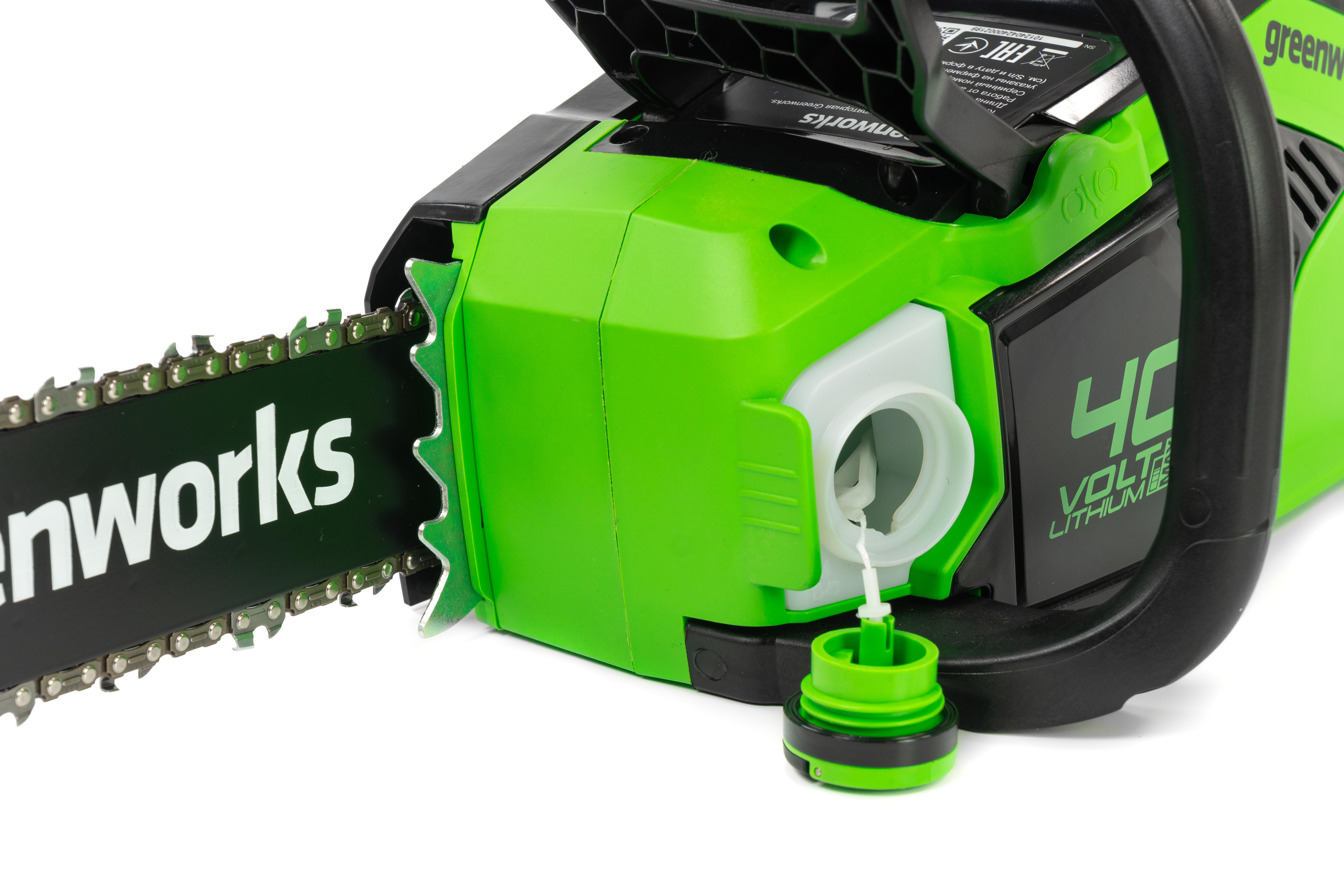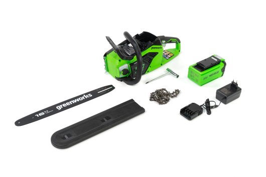 Цепная пила Greenworks GD40CS18 — отлично подойдет для полноценного ведения дачного хозяйства. Ее надежный бесщеточный двигатель сопоставим по мощности с бензиновыми аналогами на 1,5 л. с. При этом электродвигатель пилы Greenworks абсолютно экологичен, имеет высокий крутящий момент (пилит быстрее бензинового аналога), имеет низкий уровень шума и вибраций, а так же прост в эксплуатации потому, что не требует подготовки масло-бензиновой смеси и какого-либо обслуживания. Включение пилы производится одной кнопкой. Замена и установка цепи не требует инструмента.