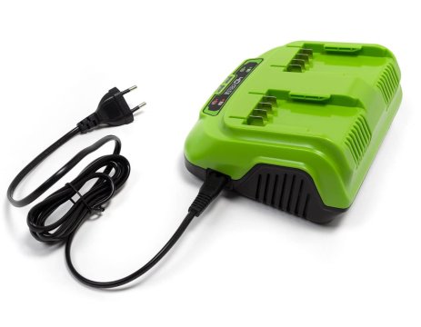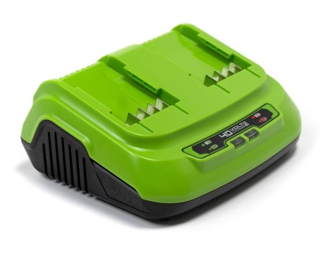 Быстрое зарядное устройство на 2 слота Greenworks G40UC8 40В 2938807 — применяется для ускоренной зарядки двух аккумуляторов напряжением 40 вольт одновременно и емкостью 2А/ч, 4 А/ч. Устройство позволит вам быстро заряжать сразу два аккумулятора. В плату зарядки встроен чип защиты от перезаряжания и при достижении уровня заряда 100% устройство отключается. На корпусе установлен индикатор заряда. Ножки устройства сделаны с резиновым покрытием, а также есть отверстие, чтобы можно было разместить зарядку на стене. Устройство питается от сети 230V AC 50-60 Гц, 8 А.