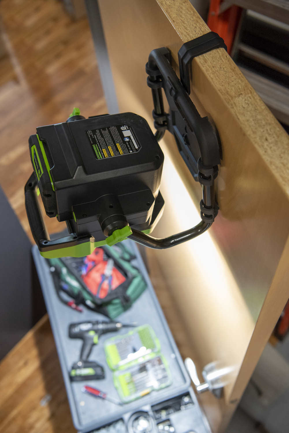Металлическая рамка с площадкой, имеющей отверстия для крепления на стену, делает эксплуатацию удобной. Прожектор легко установить на любой поверхности: можно подвесить его на S-образный крюк (идет в комплекте), закрепить на стене с помощью отверстий в рамной площадке или установить на штатив (приобретается отдельно). Для точной настройки освещения плафон прожектора вращается на 360 градусов по вертикали. О низком заряде аккумулятора (до 5%) сигнализирует снижение яркости до 500 лм и троекратное мигание. Благодаря гибким настройкам и гибридному типу питания, LED-прожектор Greenworks G82WLH может служить как портативным, так и стационарным источником света в самых разных условиях. Обратите внимание, что аккумулятор и зарядное устройство в комплект не входят.