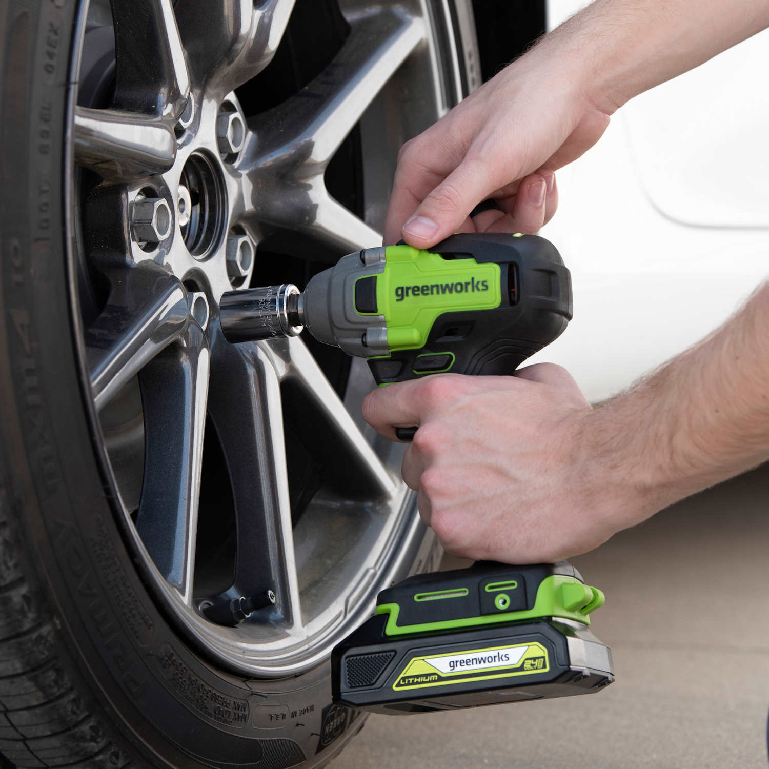 Ударный гайковерт Greenworks GD24IW400 – мощный инструмент для работ с резьбовым крепежом (гайки, болты) и метизами (винты, саморезы, шурупы) в гараже, в мастерской или на строительной площадке. Прочный и эргономичный корпус инструмента из полимера со стекловолокном и нескользящим покрытием.