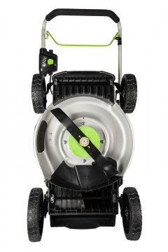 Высоту скашивания можно регулировать от 25 мм до 80 мм, со стальным приводом на все колеса. Важной системой является защита двигателя от механических повреждение, например при наезде на твердый предмет. Время автономной работы - до 600 м² от 5 А/ч батареи (АКБ и ЗУ не входят в комплект поставки). Для защиты от случайного включения предусмотрен специальный ключ безопасности и кнопка-предохранитель. Ручка газонокосилки складывается