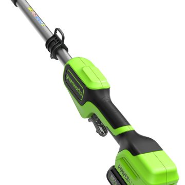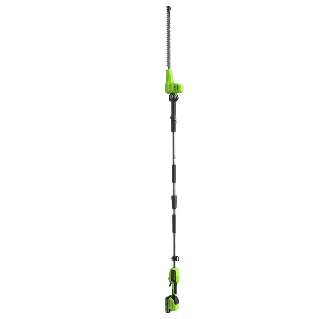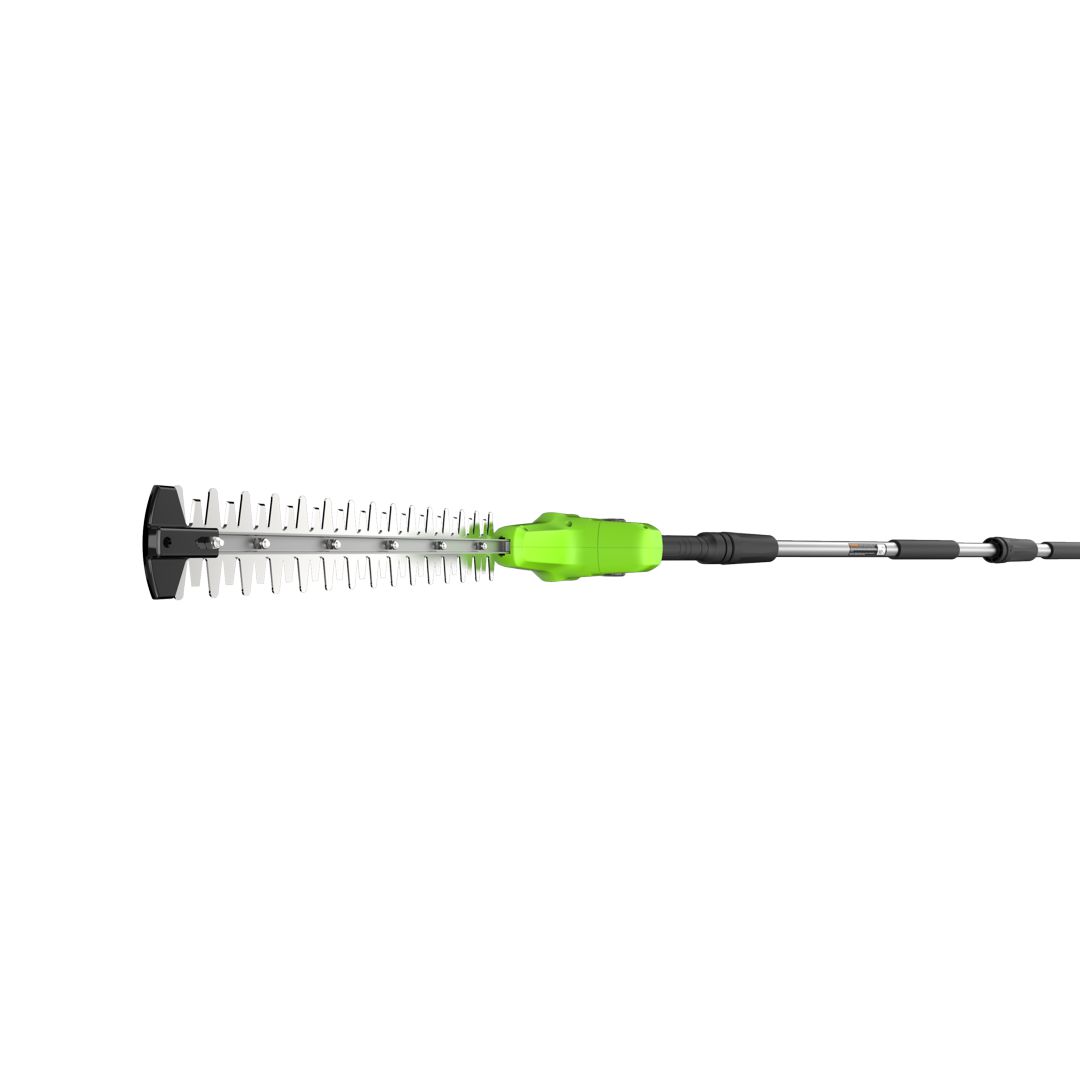 Кусторез штанговый аккумуляторный Greenworks G24PH511, 24V, 51см, без АКБ и ЗУ (2301907). Предназначен для формирования крон деревьев, ухода за кустарником и живой изгородью. В последнем случае устройство просто незаменимо! Живая изгородь может быть достаточно высокой и длинной, а штанговый кусторез позволяет выполнить работу без использования лестницы, прямо с земли, что гораздо удобнее и безопаснее. Режущая часть поворачивается на 112 градусов и имеет 6 фиксированных положений, что позволяет формировать крону растений не только по фронту, но и в горизонтальной плоскости – сверху. Стальной нож длиной 508 мм с двухсторонней алмазной заточкой гарантирует чистый срез и продолжительную работу. С установленной входящей в комплект штангой полная длина инструмента (режущая часть выставлена в одну линию со штангой)составляет 273 см. Кусторез является альтернативой не только электрическому инструменту с питанием от сети, но и бензиновому, имея перед ним ряд преимуществ. Экологичен, работает тихо и с минимальной вибрацией. Не требует сложного технического обслуживания. Прост в эксплуатации, включается одним нажатием кнопки.
