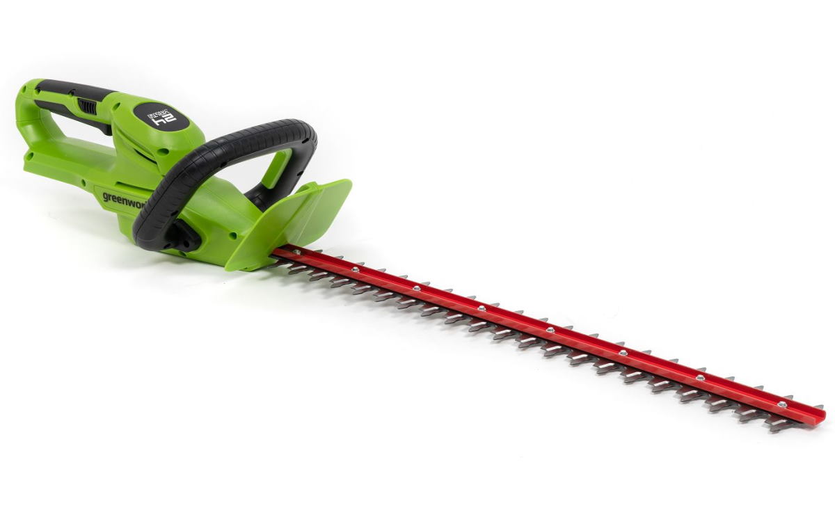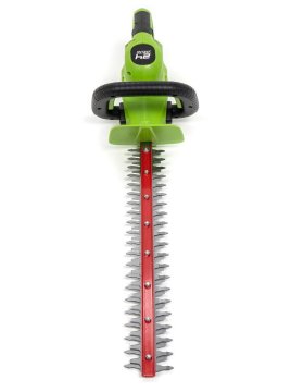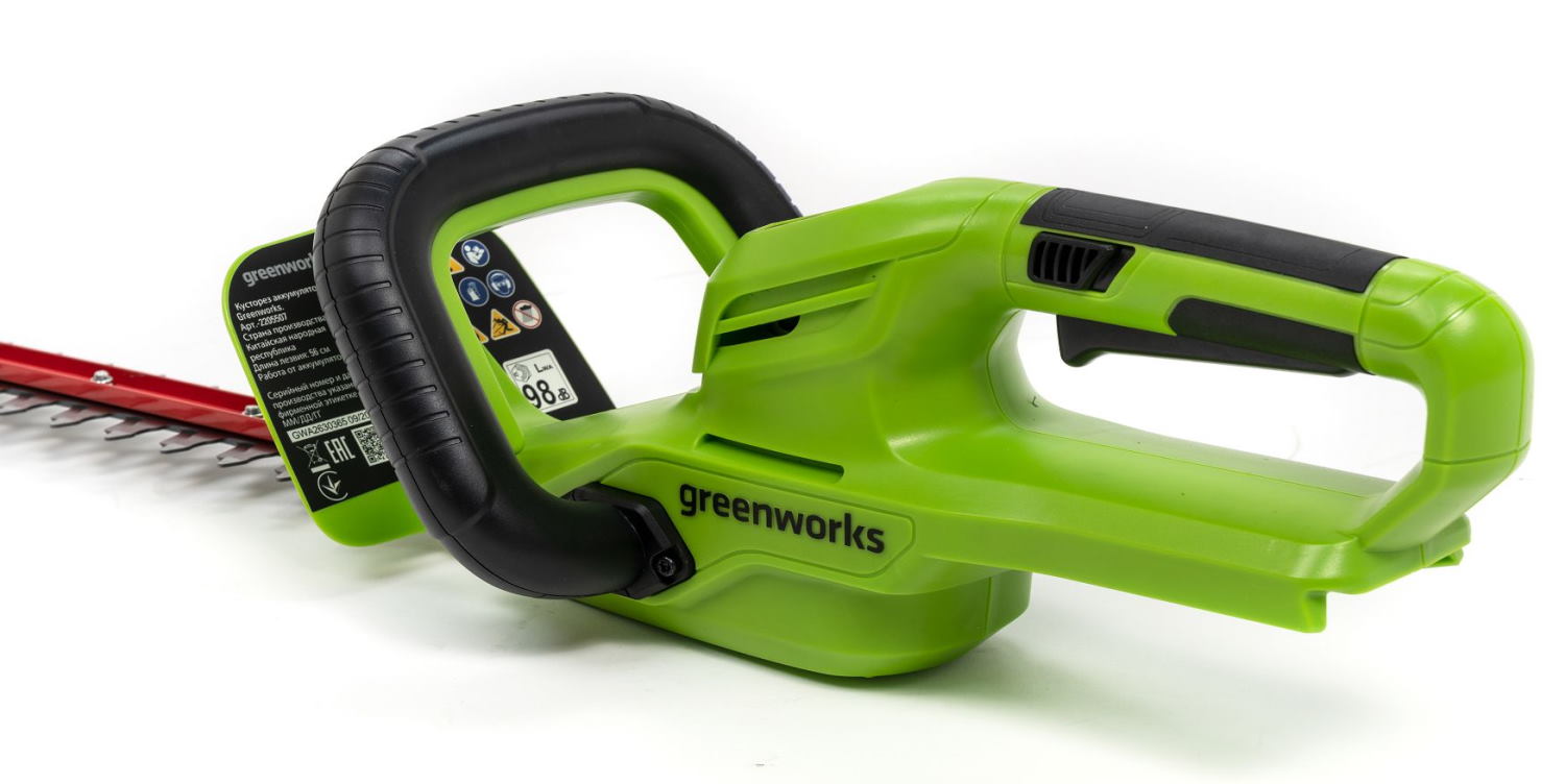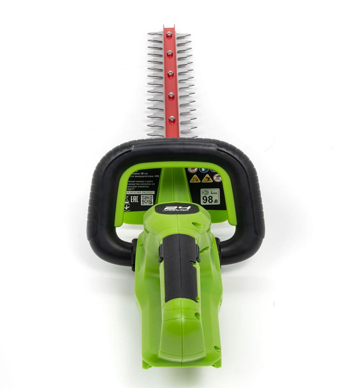 Кусторез Greenworks G24HT56 имеет лезвие с 2-х сторонней алмазной заточкой длиной 56 см и глубиной реза 18 мм, которое подойдет для выполнения большинства задач по озеленению вашего участка. Небольшой вес - 2.6 кг и высокая производительность - 3000 об/мин делают незаменимым это устройство при выполнении работ в садовом хозяйстве. Рукоять прорезинена и может поворачиваться на 180 градусов, для упрощения фигурной подрезки. Для обеспечения безопасности при использовании инструмент оборудован кнопкой-предохранителем от случайного запуска и защитным экраном для рук.