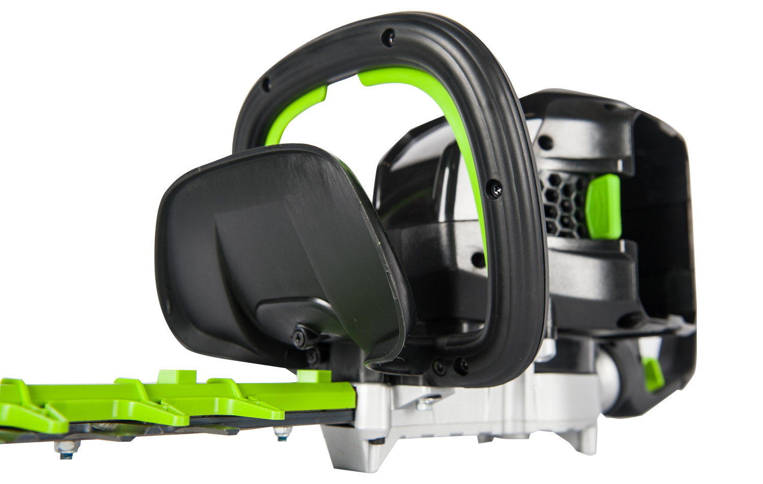 Для удобства работы рукоятка кустореза может поворачиваться на 180°. Лезвие с алмазной заточкой имеет длину 66 см. и шаг среза 33 мм., что позволяет справиться даже с толстыми ветвями деревьев. В случае застревания веток в лезвии, предусмотрен обратный ход.