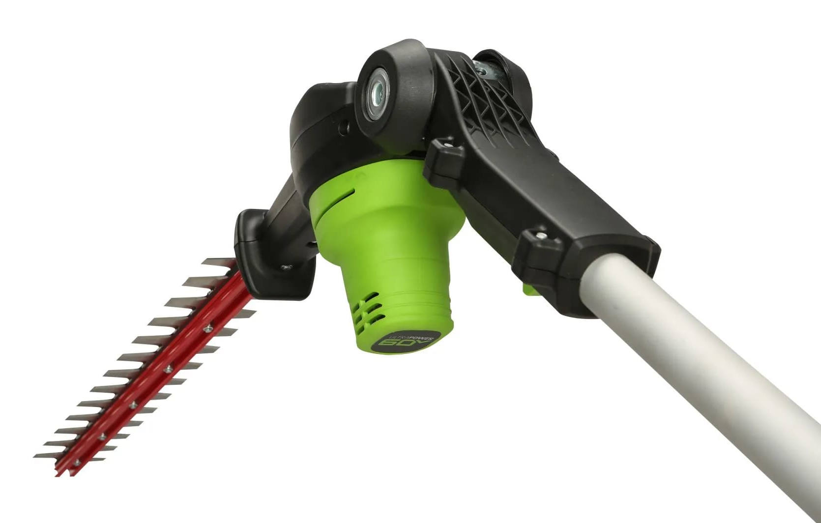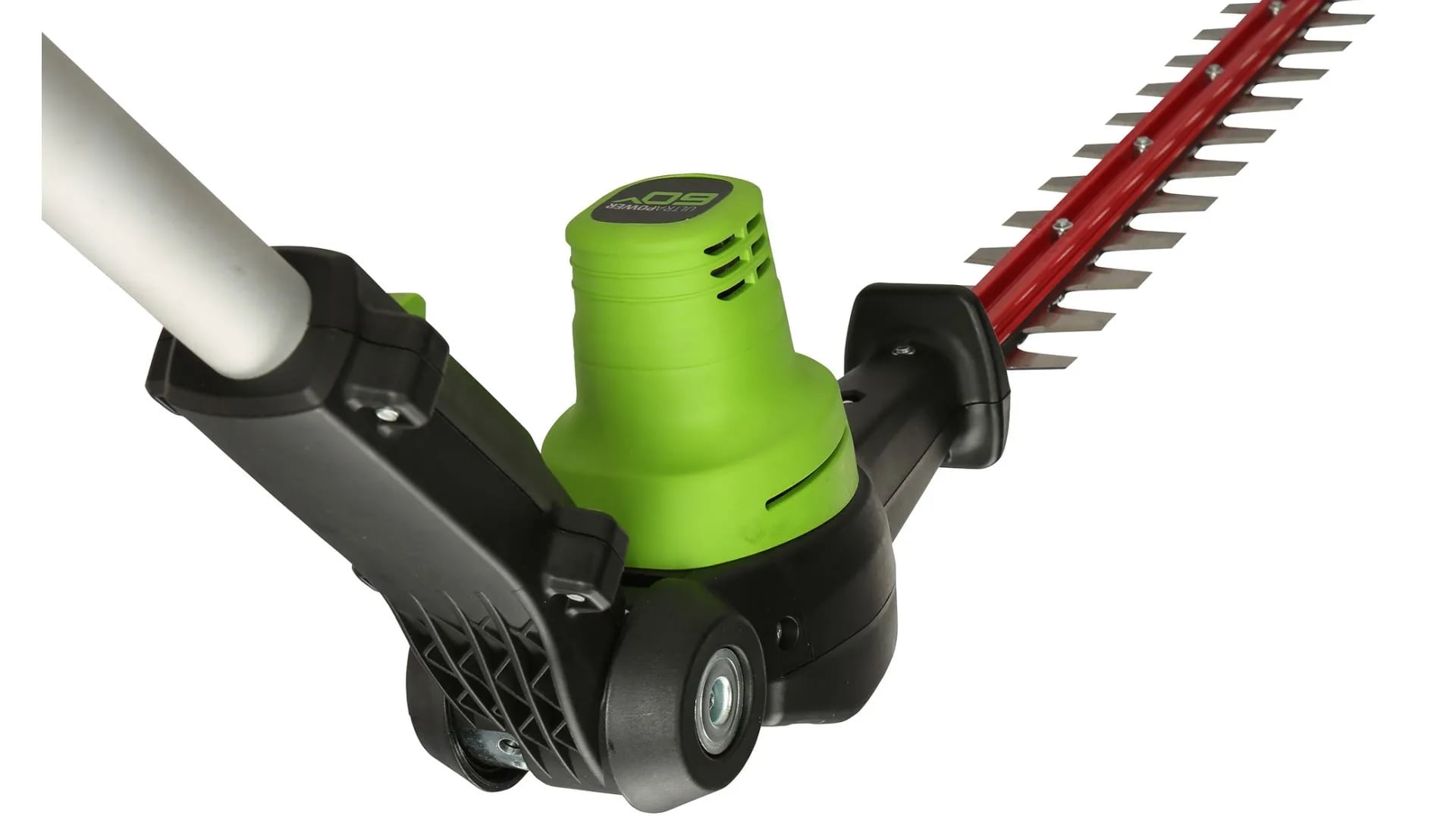 Кусторез с легкостью справится с подрезкой живых изгородей на высоте до 4-х метров благодаря составной штанге длиной - 200 см. Максимальная толщина реза составляет 30 мм, что на 60% больше, чем у инструмента предыдущего поколения. Поворотная головка с лезвием имеет 7 позиций регулировки для удобства работы. Лёгкий вес (всего 4,2 кг.) для устройств этого класса и назначения, а также низкий уровень шума и вибрации. Удобство использования обеспечено эргономичной ручкой. Кусторез оснащен предохранителем от случайного включения, а для долговечной работы двигатель имеет защиту от перегрузки.