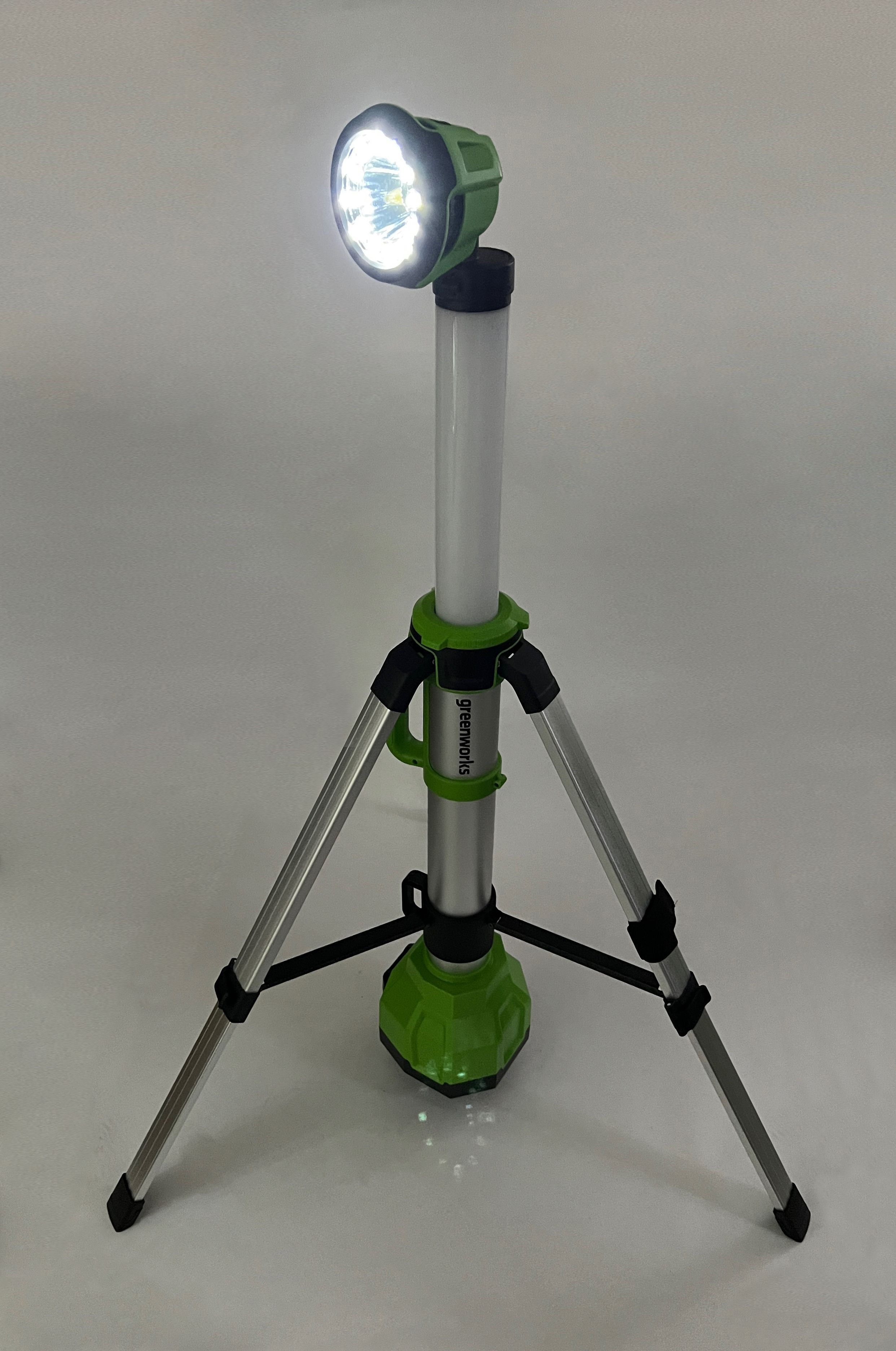 Мачта светодиодная осветительная аккумуляторная Greenworks G24WLS 2-1 подойдет для освещения больших рабочих пространств. Мачта имеет световой поток 1500 люмен в качестве фонаря и 500 люмен в режиме прожектора. Для удобства пользования тренога мачты имеет складную конструкцию, а также регулируется по высоте. Поворотный фонарь позволяет осветить нужную область. Благодаря питанию от аккумулятора 24 В, инструмент обеспечивает долгую автономную работу. Данный аккумулятор совместим с другими устройствами из линейки 24V G-24.
