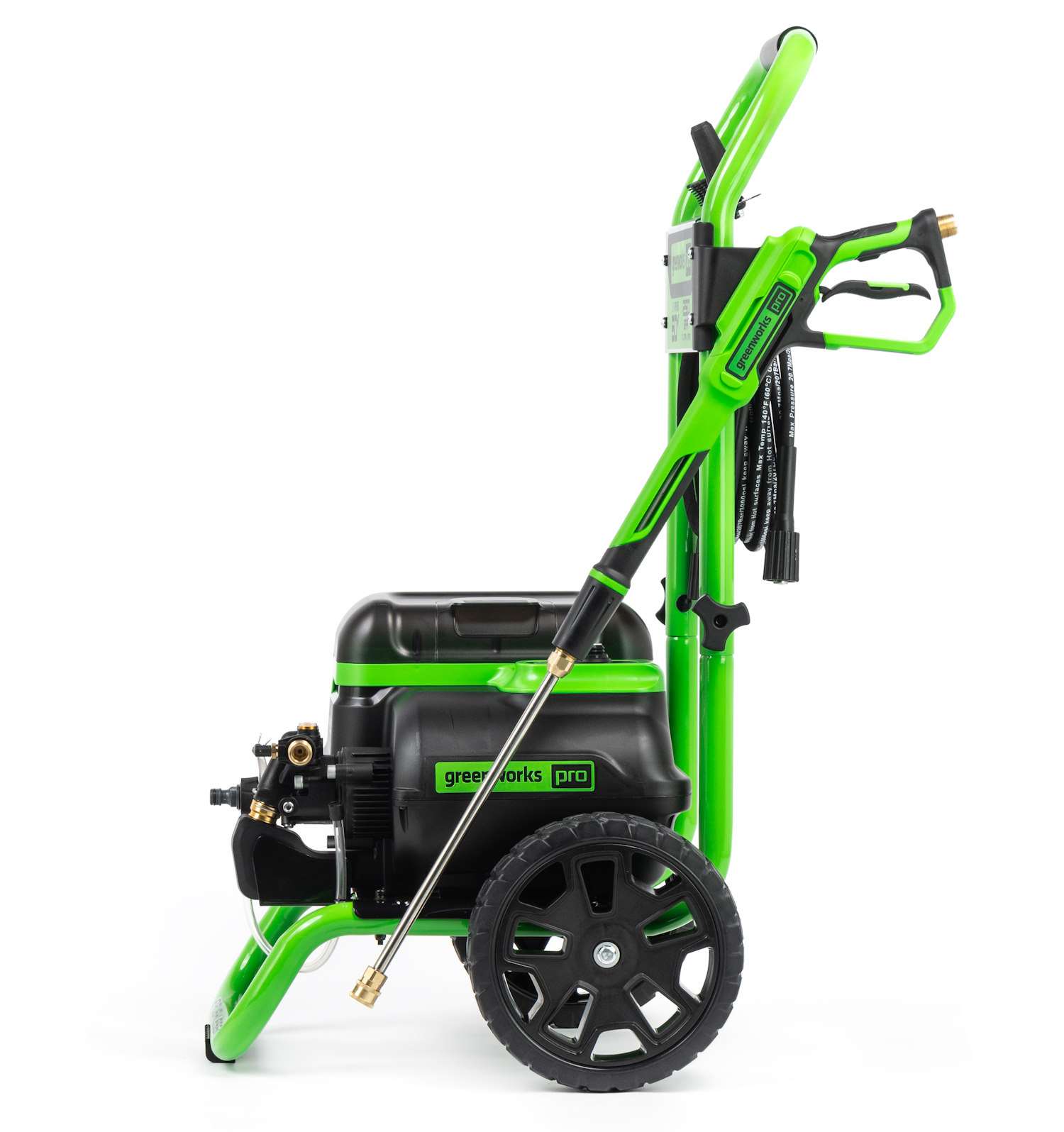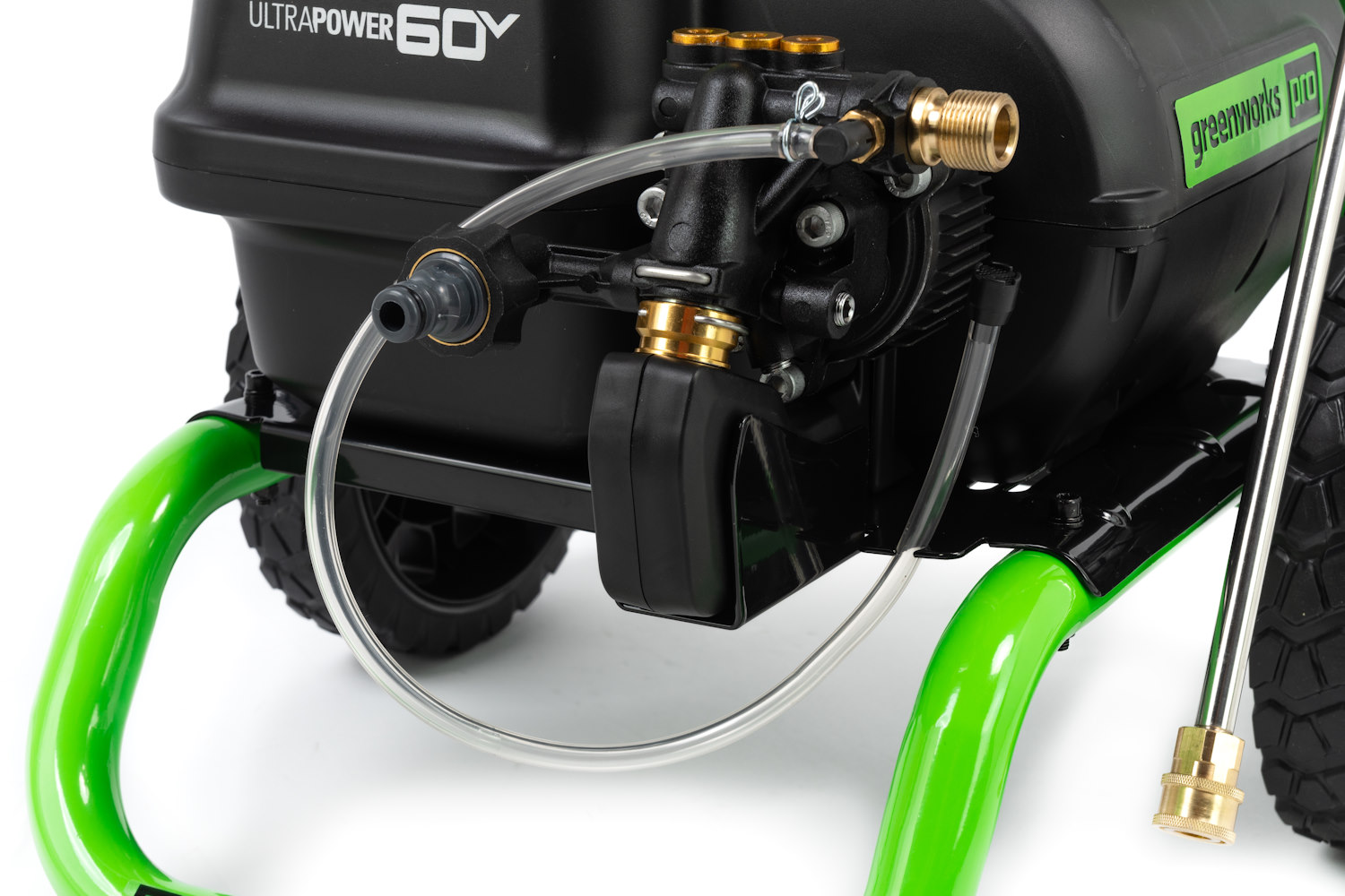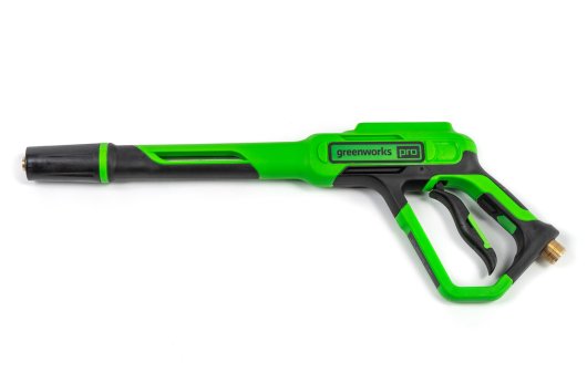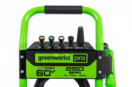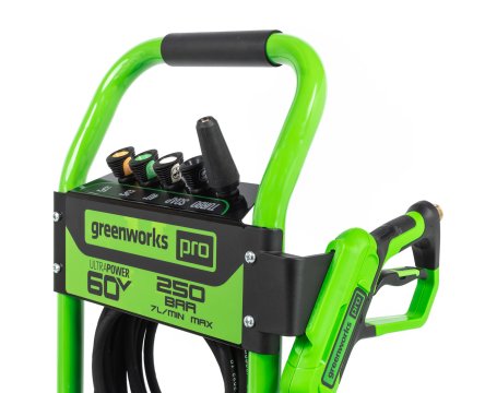 Мойка смонтирована на прочной раме и оснащена большими колесами для удобства перемещения. Пистолет, насадки, а также шланг высокого давления и электрический кабель крепятся на ручке рамы и всегда будут под рукой. Насадки имеют универсальное быстрое крепление и взаимозаменяемы для моек Greenworks. Инструмент работает от Li-ion аккумуляторов 60V совместимых с 30+ моделями полупрофессионального садового инструмента из линейки Greenworks 60V.