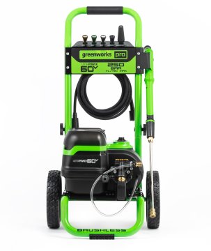 Мойка высокого давления аккумуляторная Greenworks GDPW60DP 60В, 250 бар, бесщеточная, с портом на 2 АКБ – модель из полупрофессиональной линейки Greenworks 60V. Применяется для мойки авто/мототехники, придомовых территорий, дорожек, площадок, садового инвентаря и т.д. Сочетает в себе высокую производительность с полной автономностью! Судите сами: максимальное давление 250 бар, производительность до 240 л/час. При этом мойка самовсасывающая (может производить забор воды из емкости вместо подключения к водопроводу). Работает от аккумулятора 60V (отсек на две батареи) и не зависит от розетки!