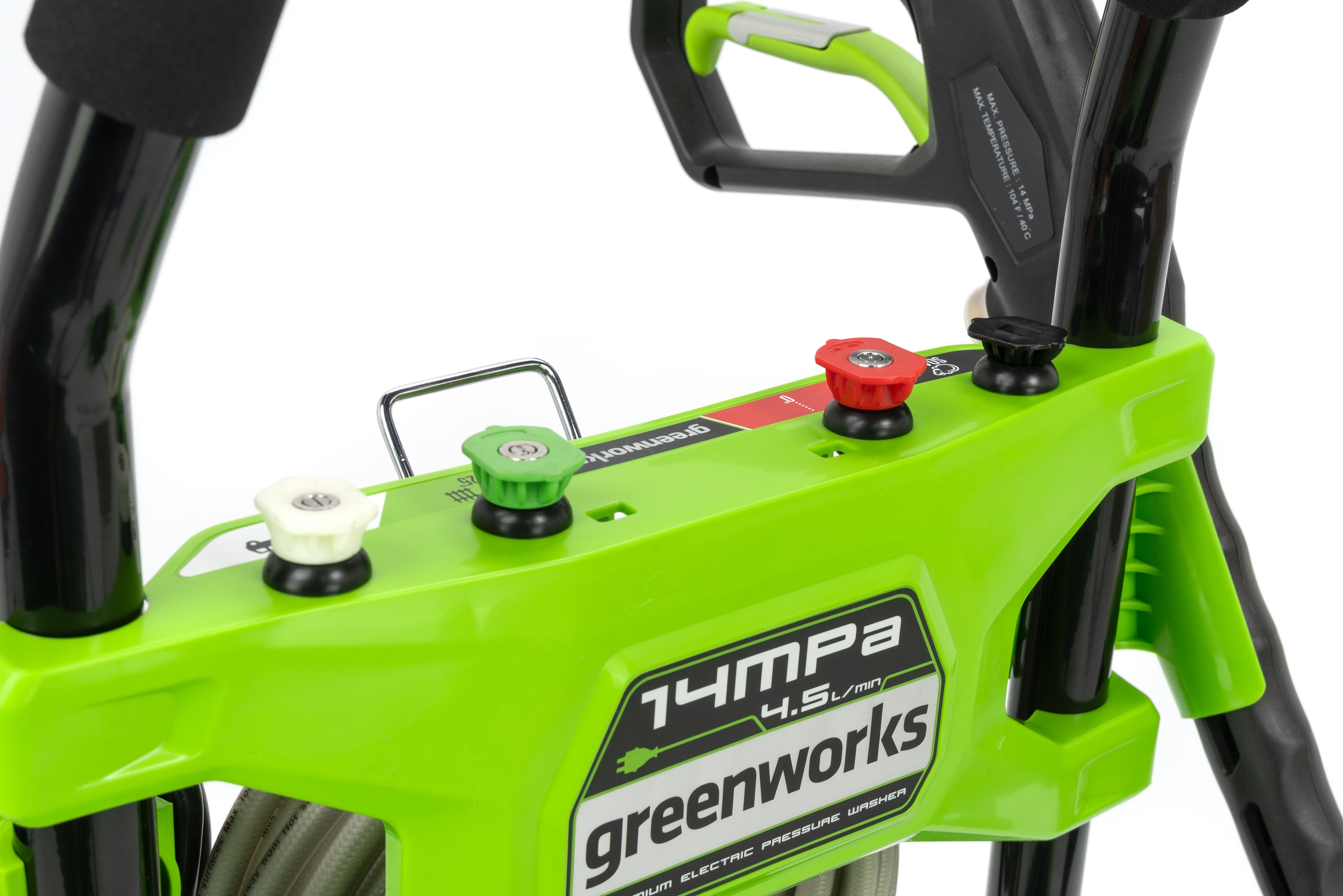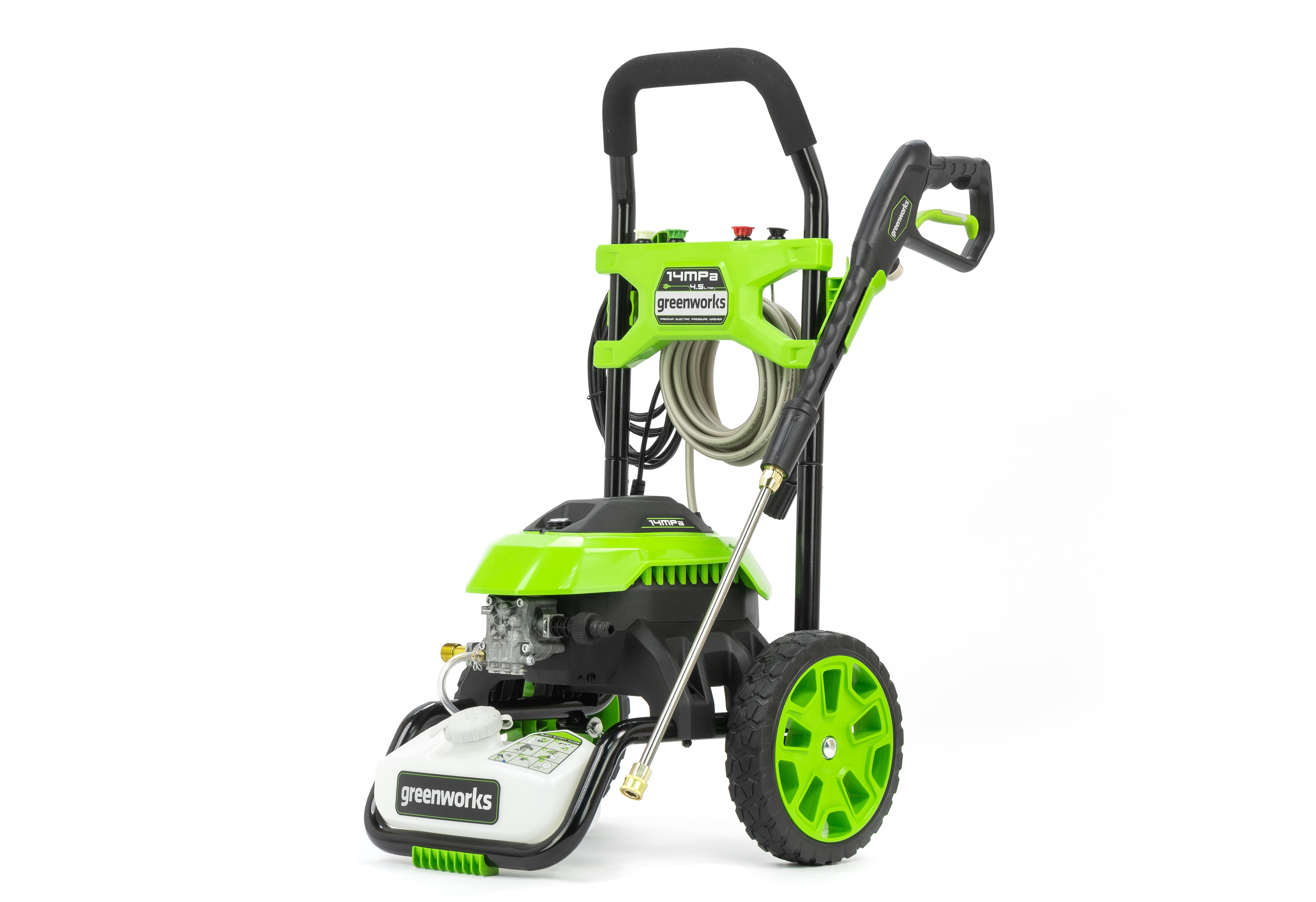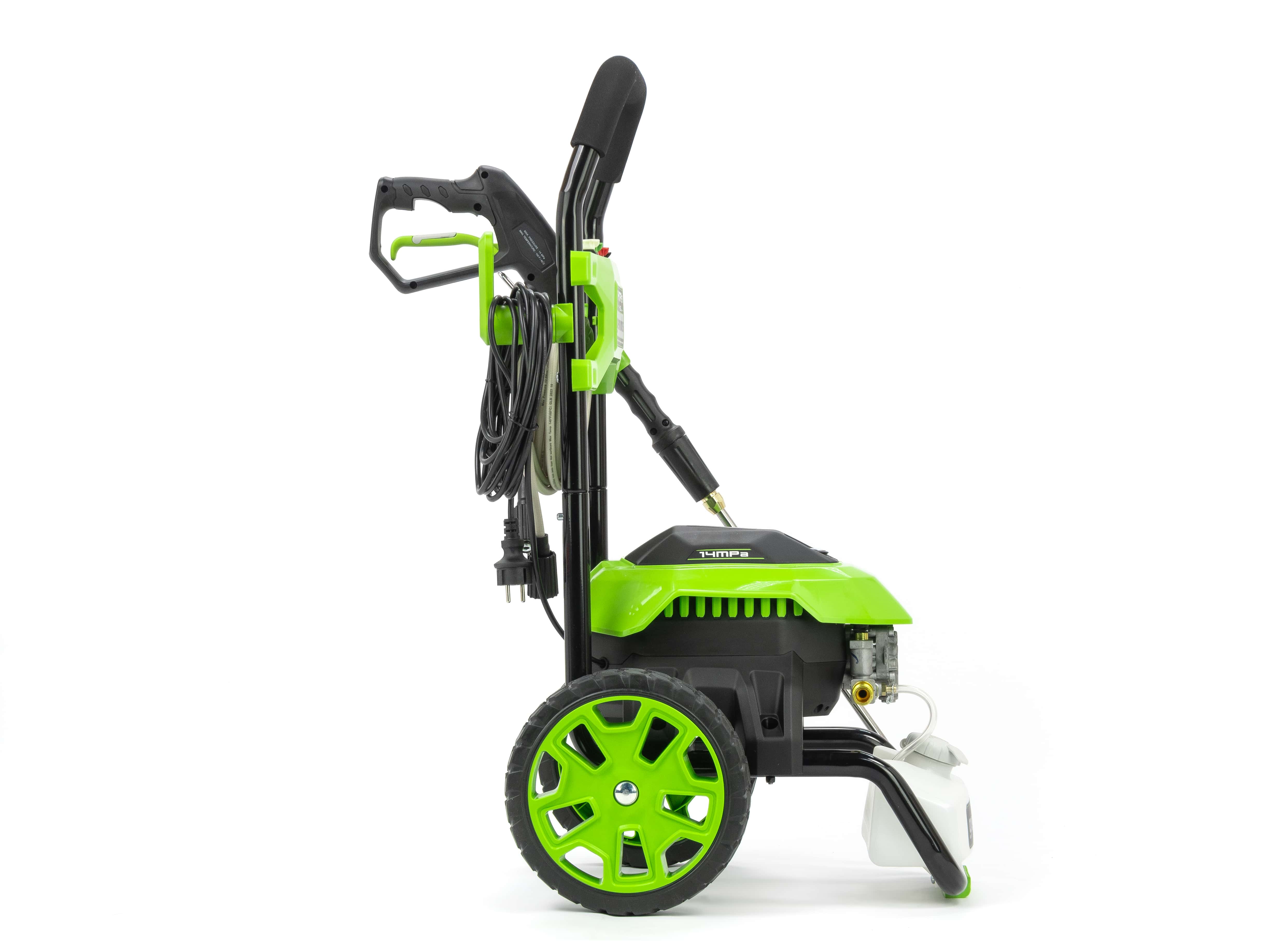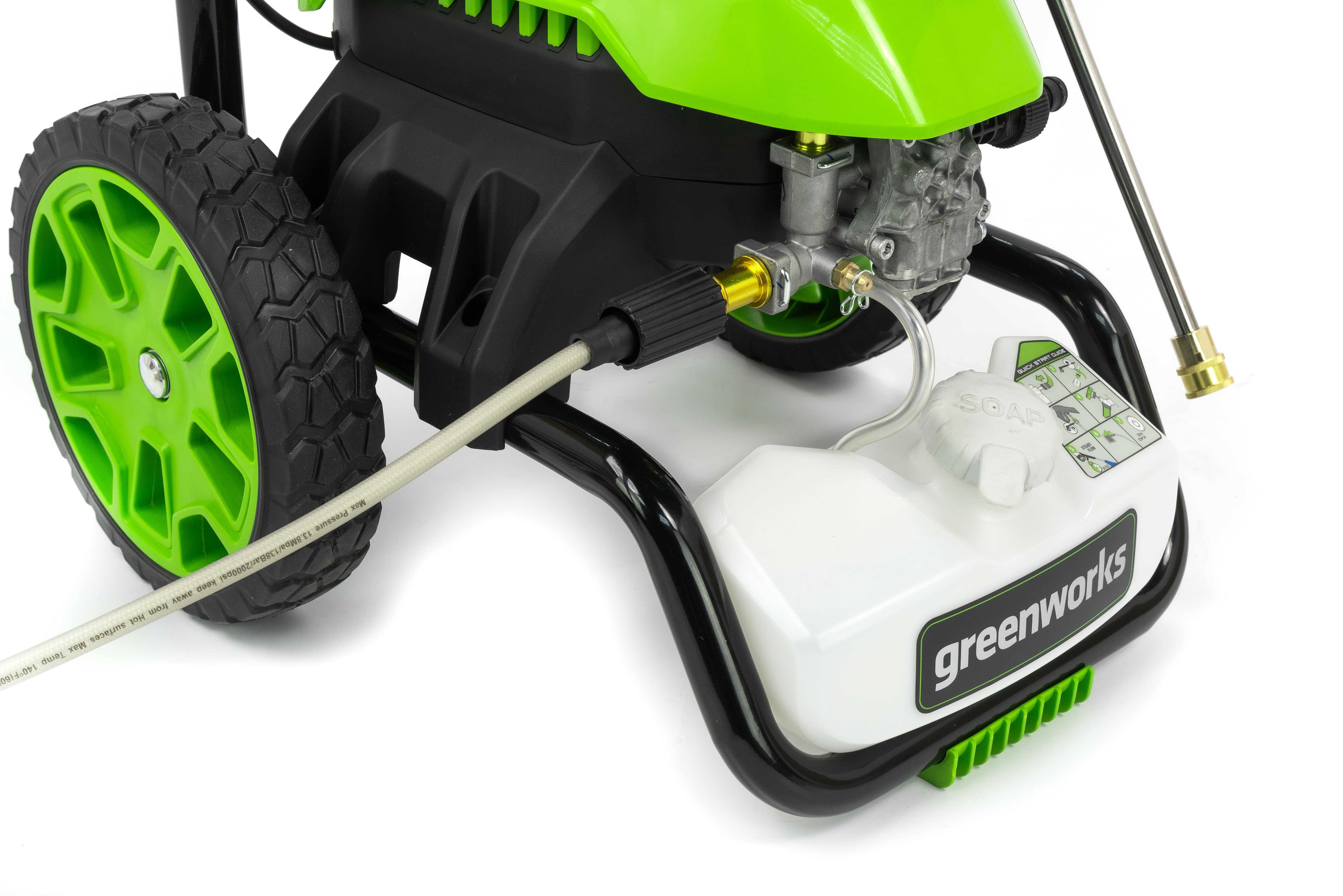 Мойка Greenworks GHP2000 имеет двигатель с медной обмоткой и мощностью 1800 Вт. Алюминиевая помпа со стальным поршнем дают максимальное давление 140 бар и производительность 360 л/час. Система “Full Stop” обезопасит мойку от разрушения помпы, если давление будет излишним. Также присутствует перепускной клапан для сброса давления. Для удобства замены насадок предусмотрен быстро зажимные коннекторы пистолета. Усиленный пистолет-распылитель оснащается распылителем из стали. На металлическом корпусе присутствуют места для хранения электрического провода, пистолета и шланга.