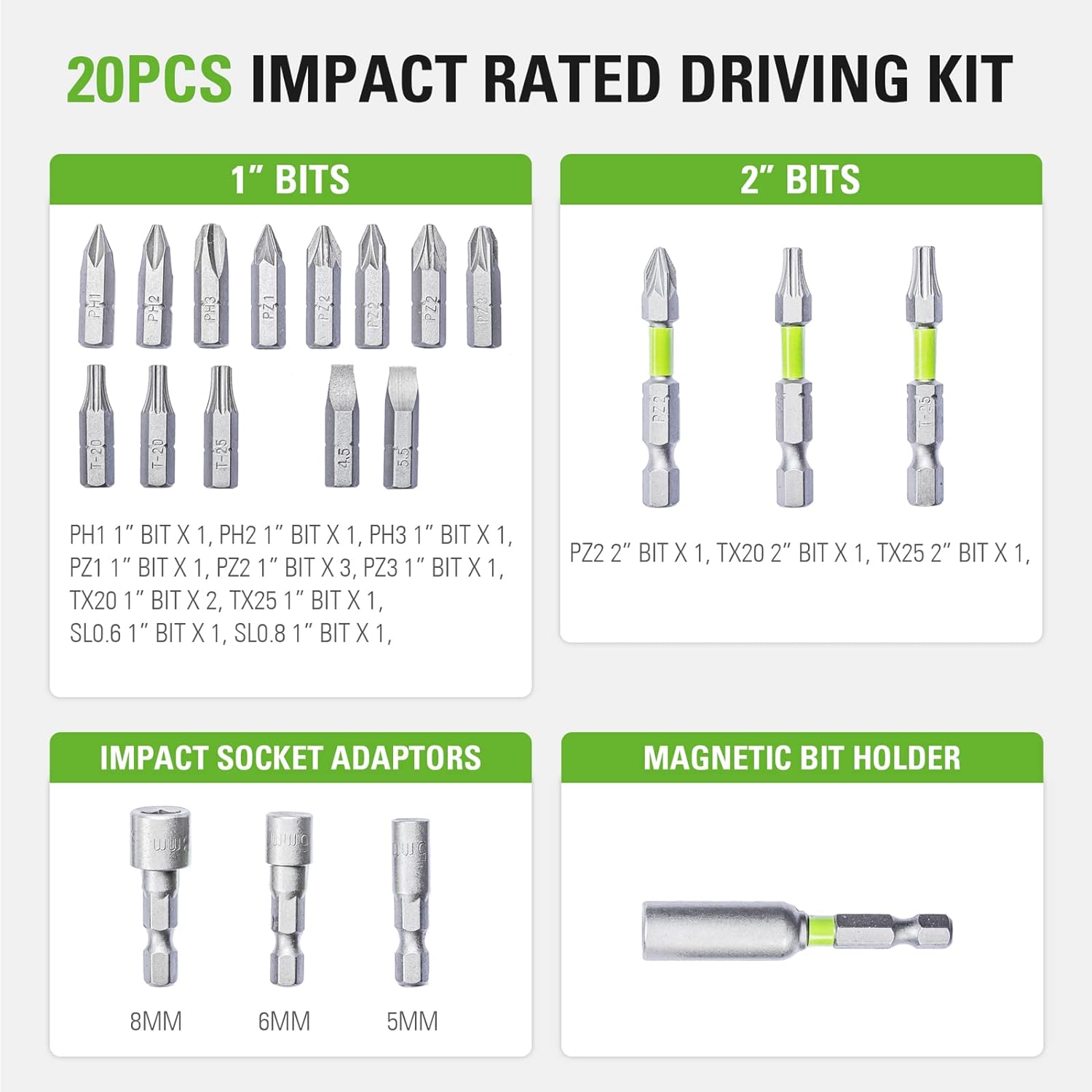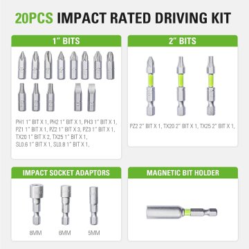 Набор содержит биты, торцевые головки и адаптеры востребованных размеров для производительной работы в мастерской или на строительном объекте