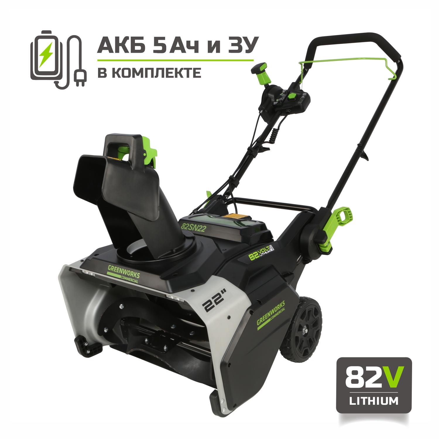 Снегоуборщик аккумуляторный Greenworks 82SN22, 82V, 56 см, с АКБ 5 Ач и ЗУ бесщеточный аккумуляторный — снегоуборщик из серии 82V для очистки средних и больших участков. Имеет ширину шнека 56 см, дальность выброса до 9 м. Оснащен 2 слотами для батарей, бесщеточным двигателем.