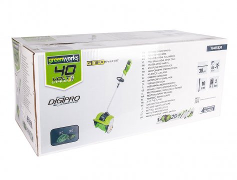 Одноступенчатая система шнека — простая и надежная, сам шнек выполнен из АBS пластика. Такой материал выбран не случайно, пластик легкий и не нагружает двигатель, а главное такой шнек не царапает декоративные покрытия. Еще одним достоинством является долгое время автономной работы от одной батареи — до 40 минут от 4 А.ч. Снегоуборщик оснащен системой защиты от случайного включения и дополнительной ручкой для крепкого хвата. Как уже было отмечено снегоуборочная лопата входит в серию Greenworks G-MAX 40V и работает от аккумуляторных батарей G-MAX 40V.