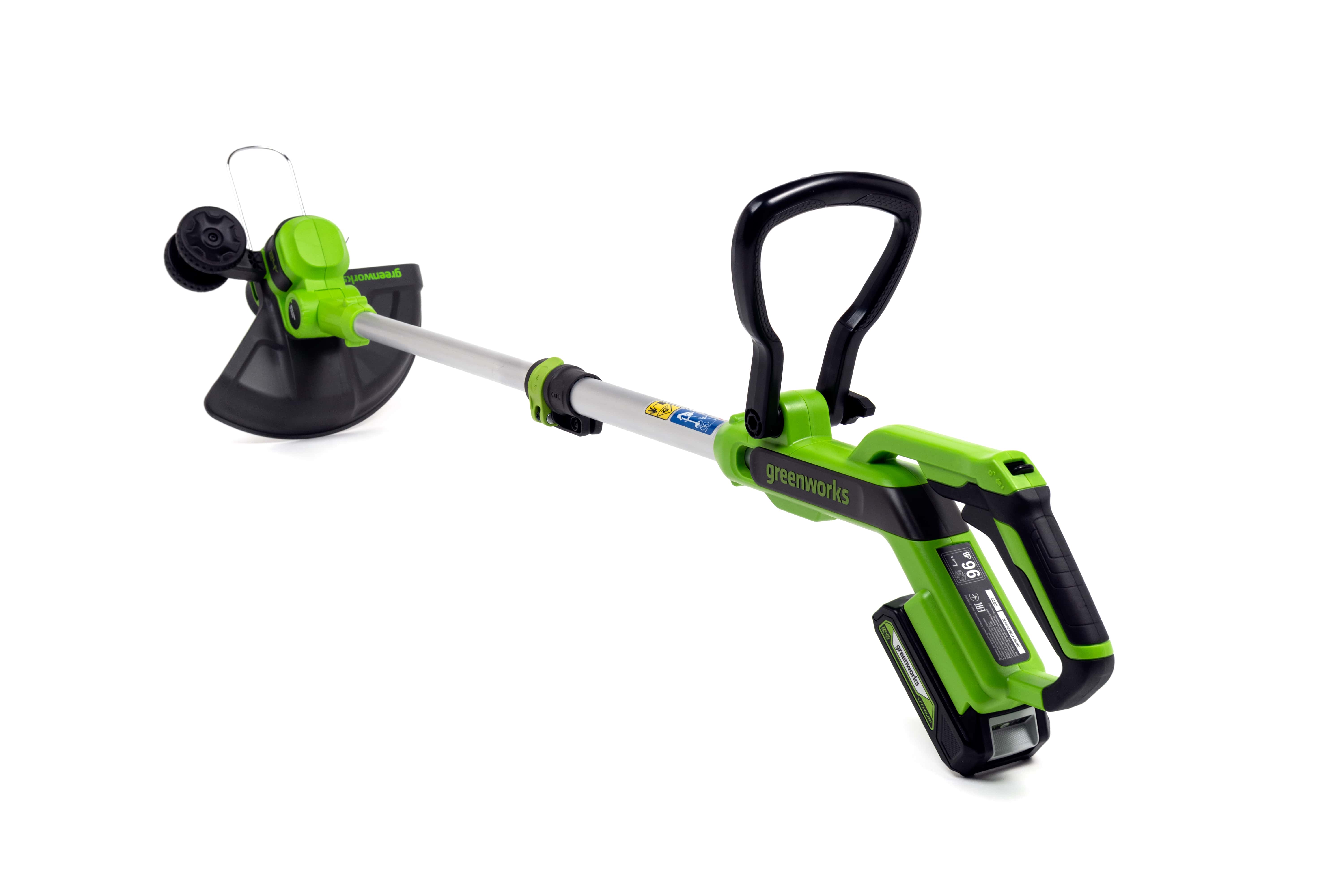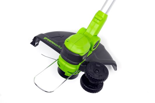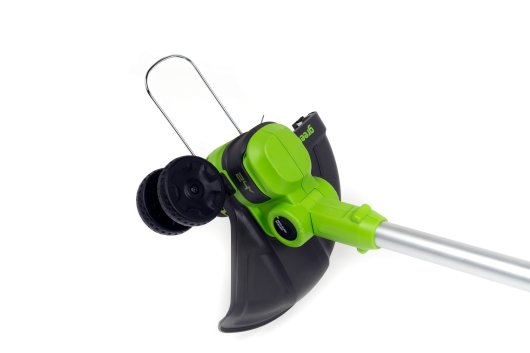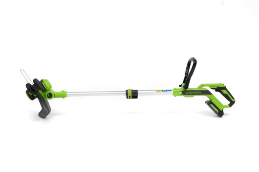 Триммер работает от аккумулятора Greenworks 24V — независимость от сети дает обрабатывать труднодоступные участки. В сравнении с бензиновыми устройствами аккумуляторный триммер является экологичным инструментом и имеет малый шум и вибрацию.