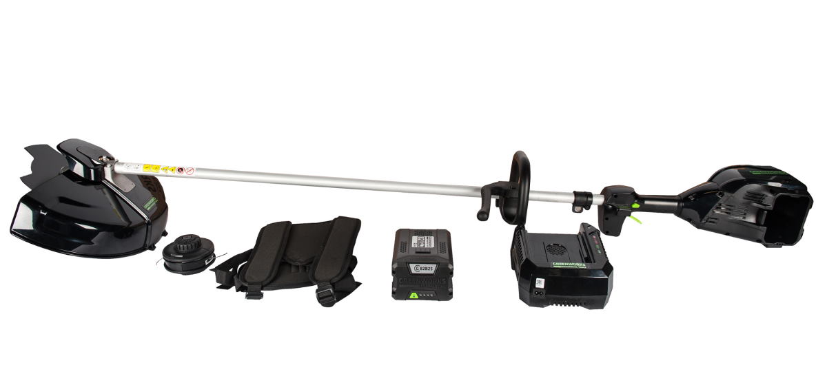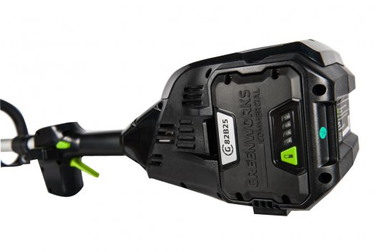 Аккумуляторный триммер Greenworks из линейки устройств 82V Commercial (модель GD82BC). Данная модель относится к коммерческой серии, триммер с легкостью справиться с высокой и густой травой, а благодаря металлическому диску (в комплекте) можно резать даже крупный кустарник и сухостой.
