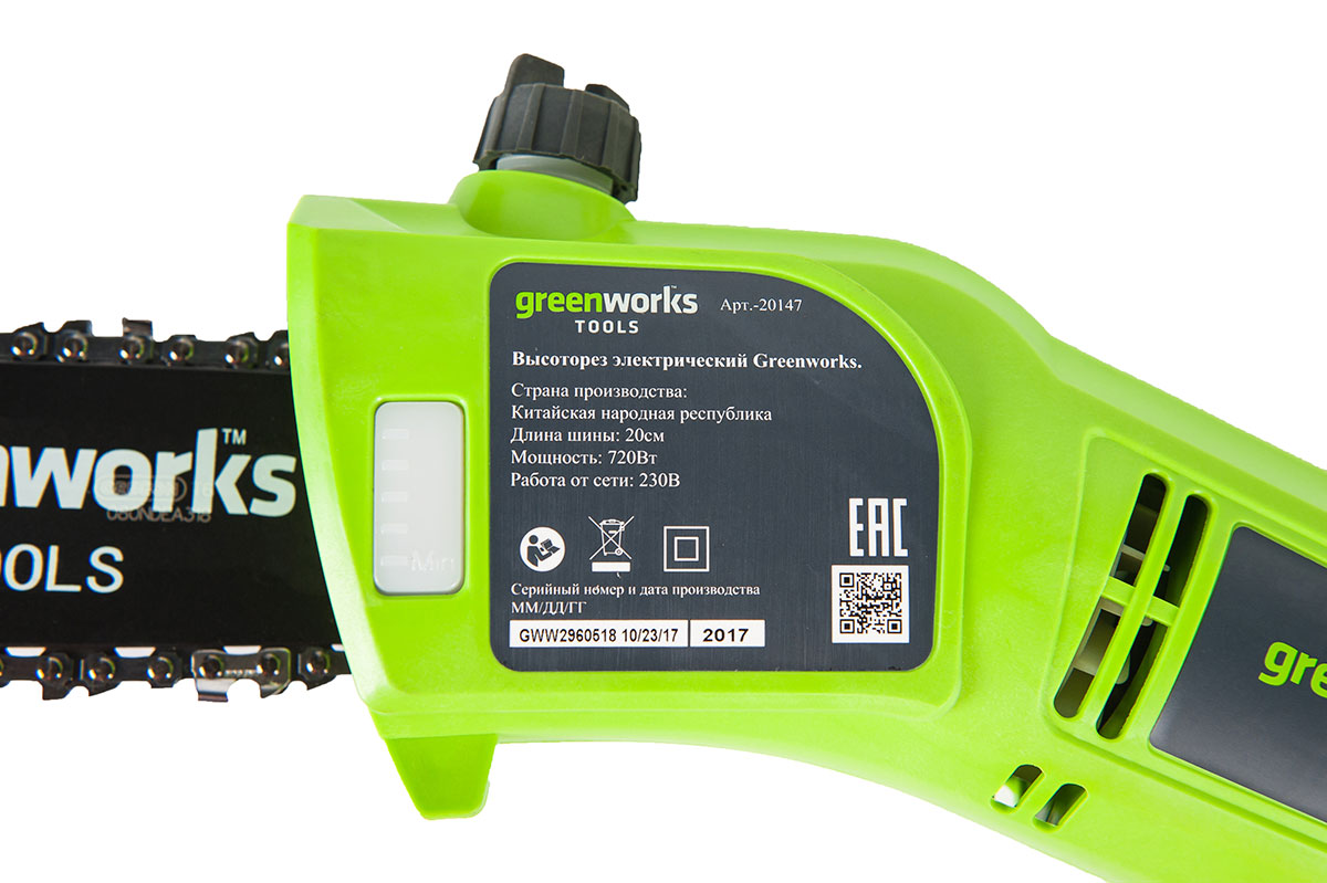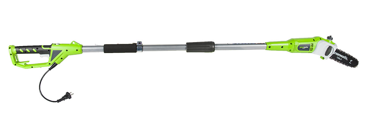 Электрический высоторез (сучкорез) Greenworks GPS7220 мощностью 720W — специальное приспособление для простоты и удобства подрезки ветвей и сучьев деревьев на высоте до 4-х метров.