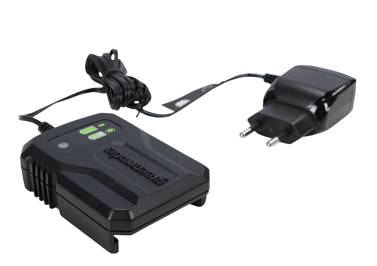 Зарядное устройство-слайдер Greenworks G24UC2 24V 2A 2946207 заряжает 2Ач и 4Ач аккумуляторы серии Greenworks 24V. Зарядка оснащена специальным защитным чипом от перезаряда и перегрева. На корпусе устройство располагается индикатор зарядки аккумулятора. Питание зарядки от сети 230 вольт переменного тока 50-60 Гц. Максимальный ток заряда 2 А. Зарядное устройство заряжает 2 Ач батарею за 60 мин, 4Ач — 120 мин.