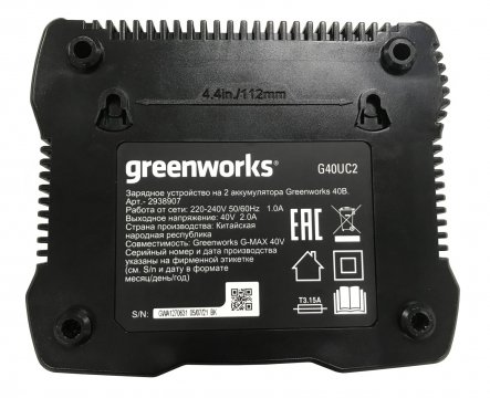 Зарядное устройство Greenworks 40V G40UC2 (арт. 2938907) – применяется для синхронной/параллельной зарядки двух аккумуляторов из серии G-MAX напряжением 40 Вольт.