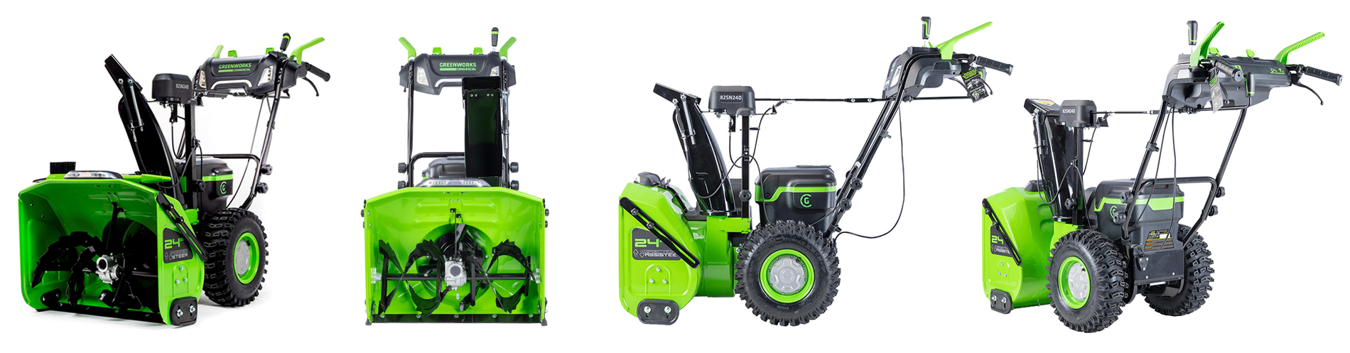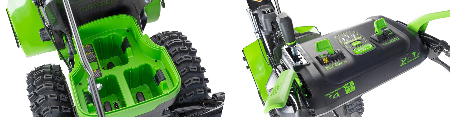 Greenworks GD82ST56 — это первая аккумуляторная снегоуборочная машина, которая может двигаться самостоятельно (то есть имеет привод на колеса). Хотя обычно, аппараты, работающие от электросети или АКБ приводятся в движение усилиями оператора. Аграгат отличается возможностью переключения скоростей: 3 вперед и одна назад.