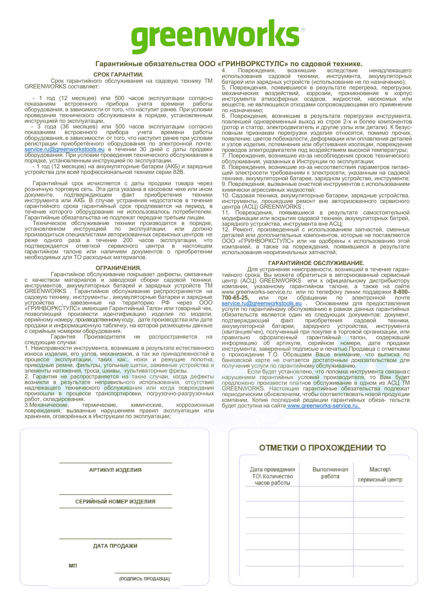 Гарантия не распространяется на дефекты, возникшие вследствие условий, не подконтрольных компании Greenworks, в том числе — в результате использования не по назначению, сетевой перегрузки, неправильной сборки, использования продукта или его комплектующих с нарушением письменных инструкций или руководства компании Greenworks, а также памятки по безопасности. Гарантия не распространяется на ущерб, нанесенный имуществу и иной собственности пользователя, а также третьим лицам.