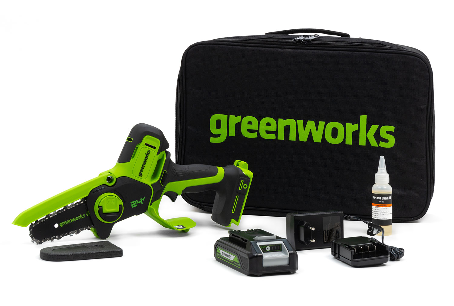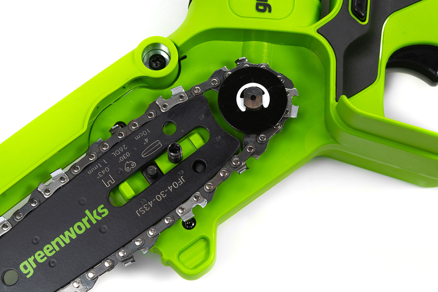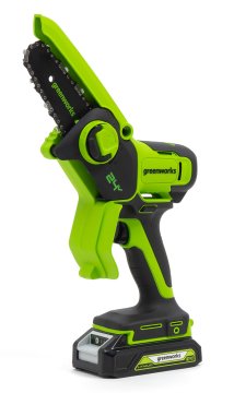 Компактная и удобная мини-пила Greenworks G24MCS10 24V с шиной 10 см и скоростью цепи до 7,8 м/с прекрасно подойдет для обрезки веток и сучьев в тех случаях, где тяжело использовать громоздкий инструмент. Инструментом удобно работать одной рукой за счет компактных размеров и небольшого веса. Такая пила подойдет для походов, подрезки веток в труднодоступных местах, а также поможет при изготовлении деревянных скульптур.