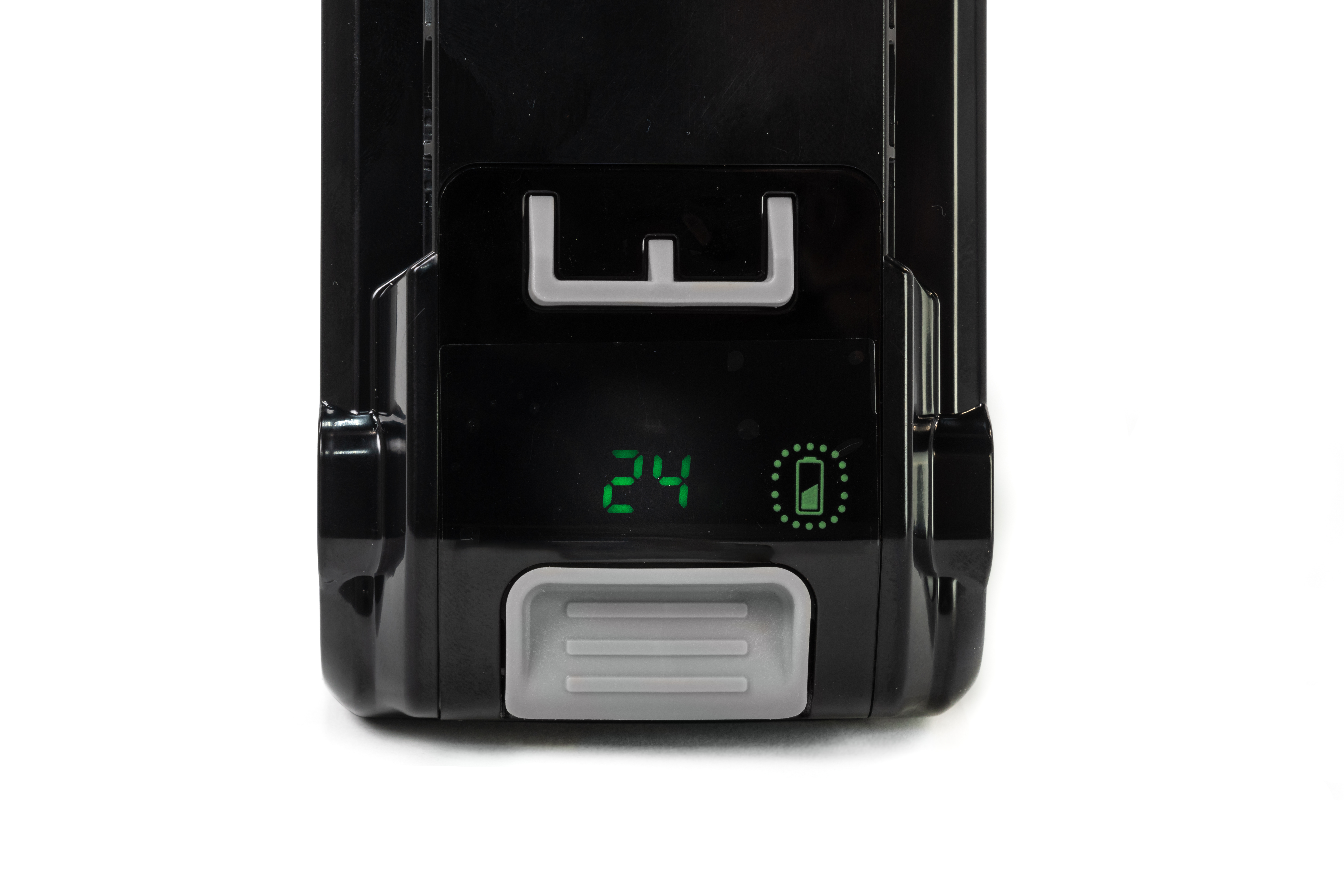 Корпус аккумулятора обладает прорезиненными накладками для удобного захвата. Батарея G24B4+ оснащена цифровым светодиодным индикатором с точным указанием заряда в процентах.