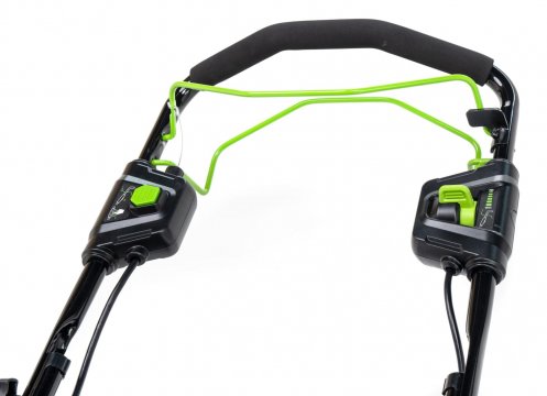 Газонокосилка оснащена 2-х слотовым батареепримником с функцией Switchover. Когда первый аккумулятор разрядится, произойдет автоматическое переключение на второй. Благодаря подшипникам колеса рассчитаны на длительное время эксплуатации. Привод косилки на задние колеса. Регулировка скорости перемещения в диапазоне 1,8-5,4 км/ч.