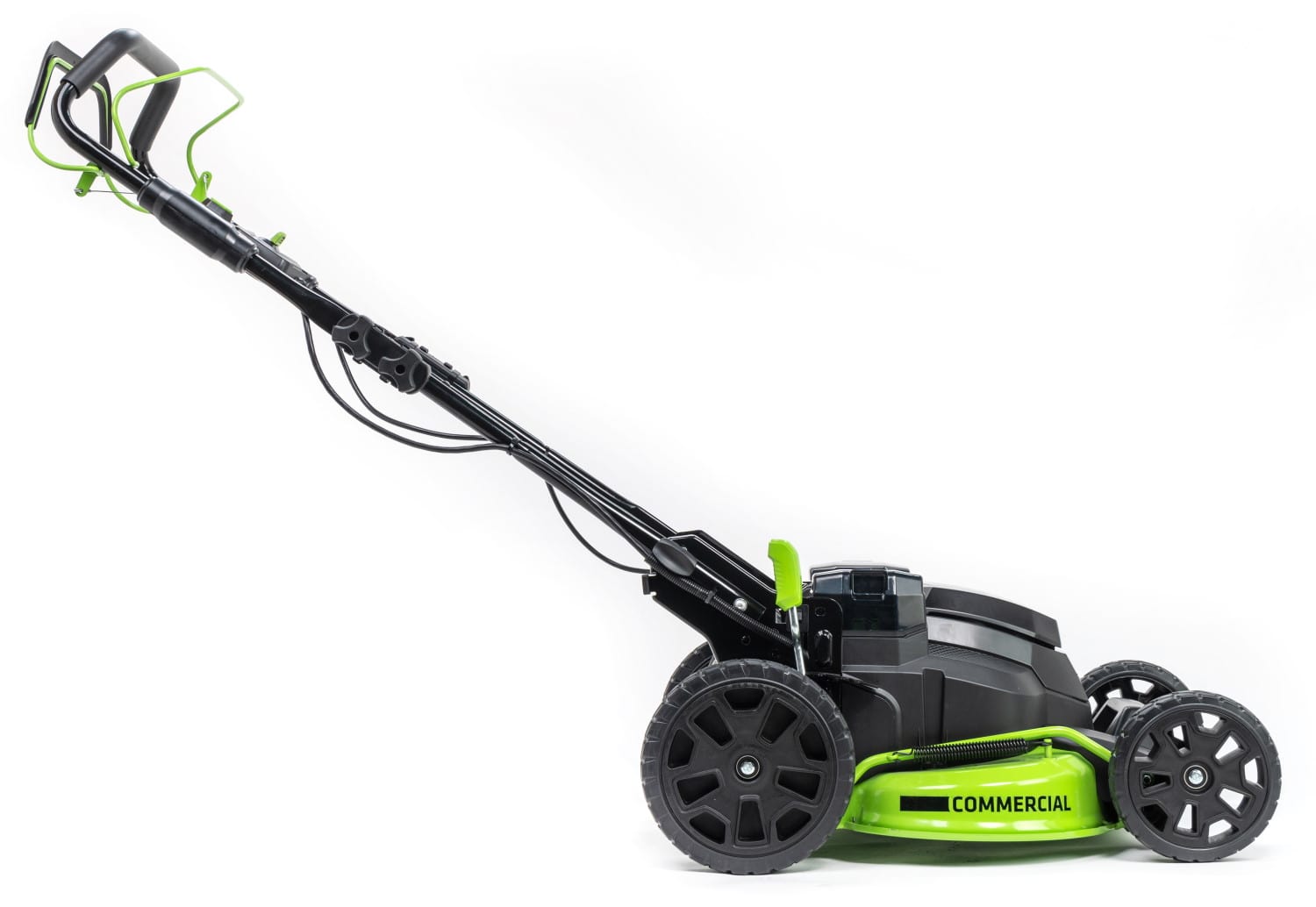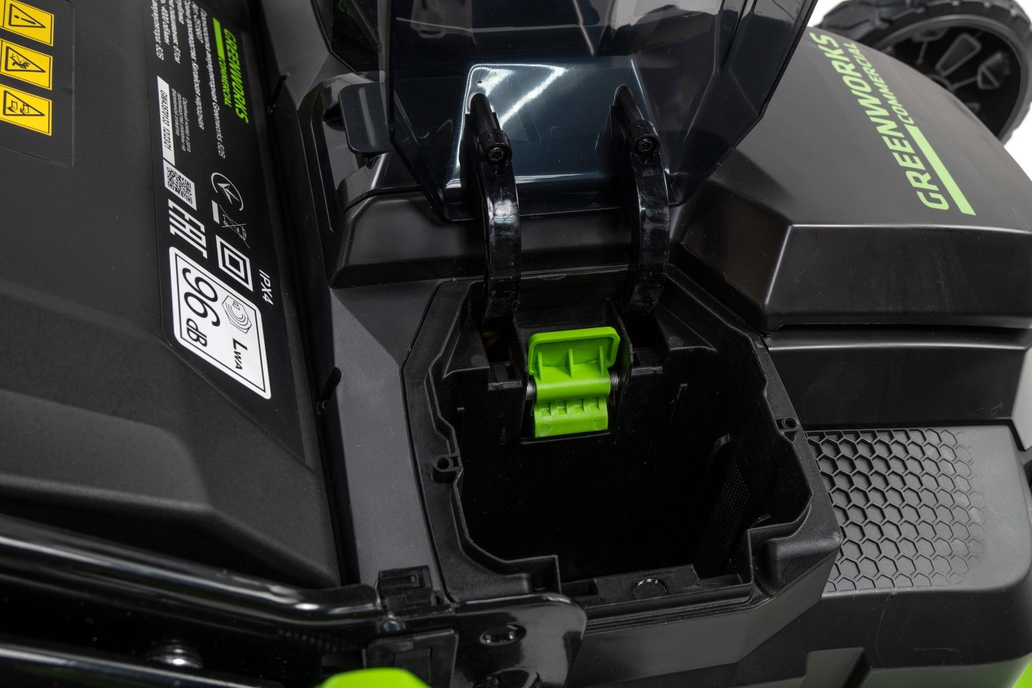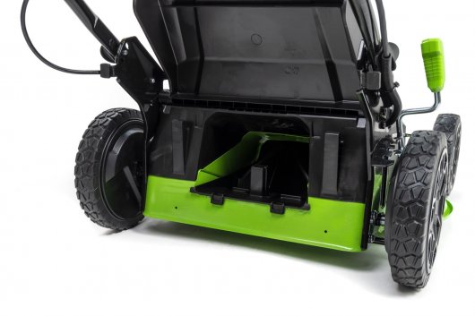 Скорость вращения лезвия — 4 000 об/мин и ширина среза газонокосилки — 61 см, что позволяет обрабатывать достаточно большие территории. Cкорость газонокосилки при работе в автономном режиме — 0.5-1.5 м/с. Высоту скашивания можно регулировать от 2.5 см до 8 см. Газонокосилка оборудована двумя слотами для аккумуляторов, благодаря чему вы сможете увеличить время автономной работы вдвое. Объем травосборника — 70 литров, что даст вам больше времени для покоса.