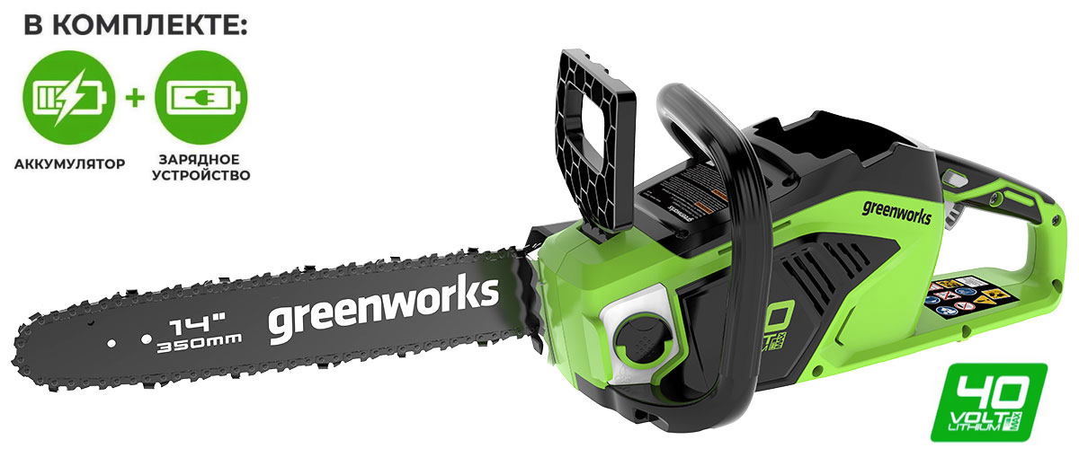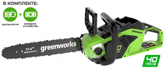 Пила оснащена шиной (35 см) из кремнистой стали и цепью производства компании Oregon. Масляный бачок для смазки цепи имеет прозрачный корпус, чтобы вы всегда могли следить за уровнем масла. Для безопасности предусмотрен предохранитель включения и тормоз цепи. Для долговечной работы двигатель имеет защиту от перегрузки. Пила работает от аккумуляторной батареи G-MAX 40V, которую можно использовать с другими устройствами линейки 40V (15+ устройств).