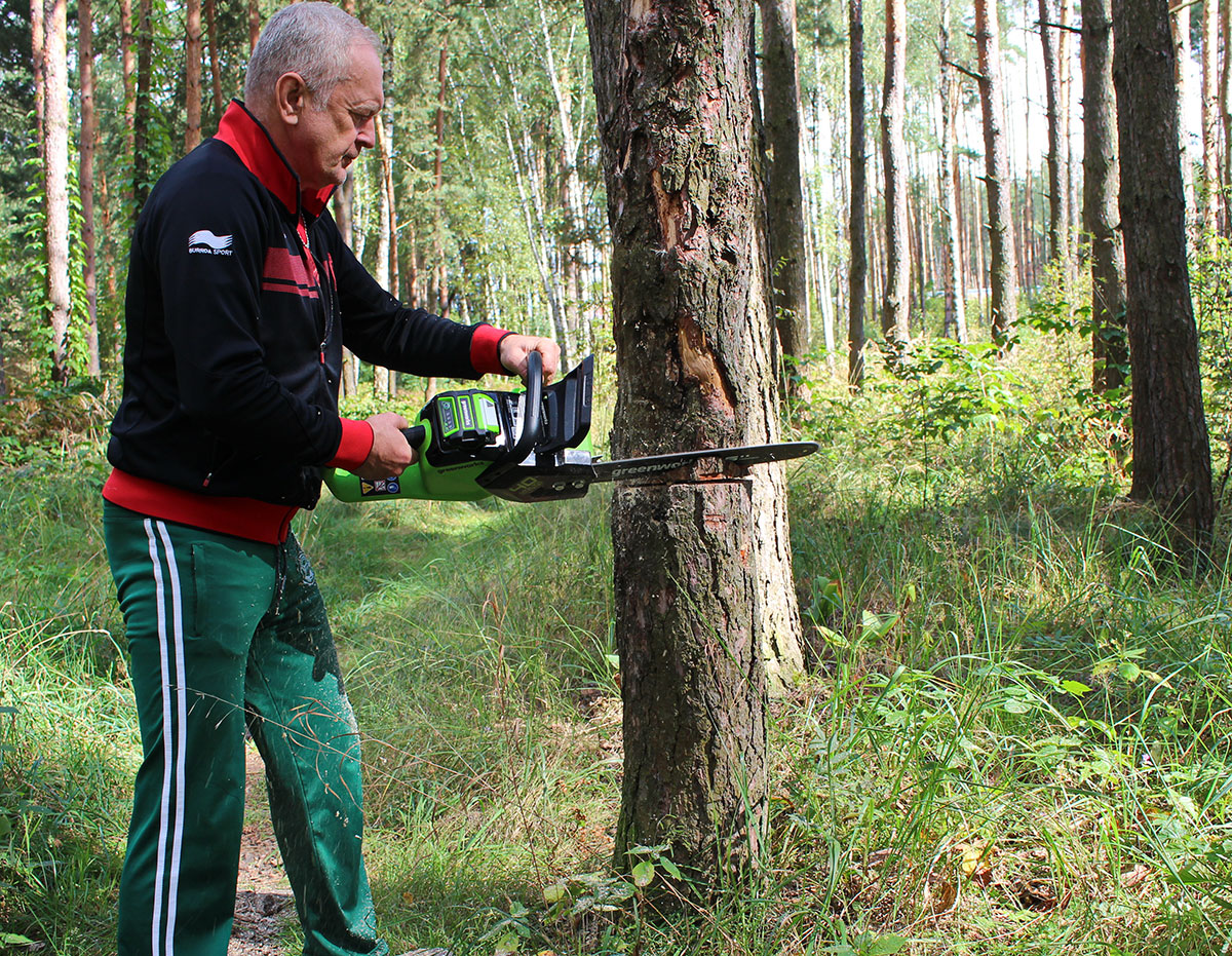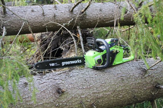 Цепная пила Greenworks GD40CS18 — отлично подойдет для полноценного ведения дачного хозяйства. Ее надежный бесщеточный двигатель сопоставим по мощности с бензиновыми аналогами на 1,5 л. с. При этом электродвигатель пилы Greenworks абсолютно экологичен, имеет высокий крутящий момент (пилит быстрее бензинового аналога), имеет низкий уровень шума и вибраций, а так же прост в эксплуатации потому, что не требует подготовки масло-бензиновой смеси и какого-либо обслуживания. Включение пилы производится одной кнопкой. Замена и установка цепи не требует инструмента.