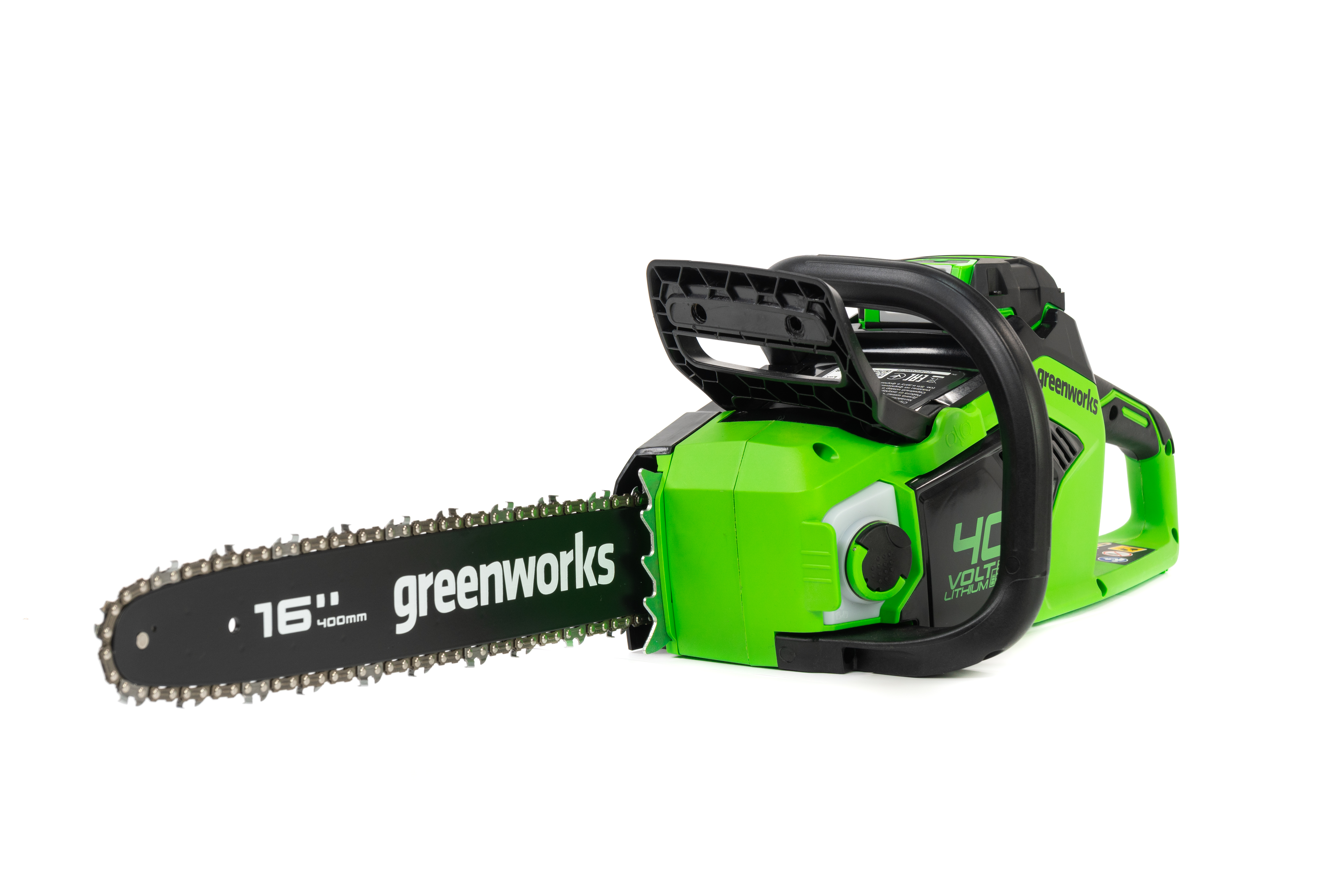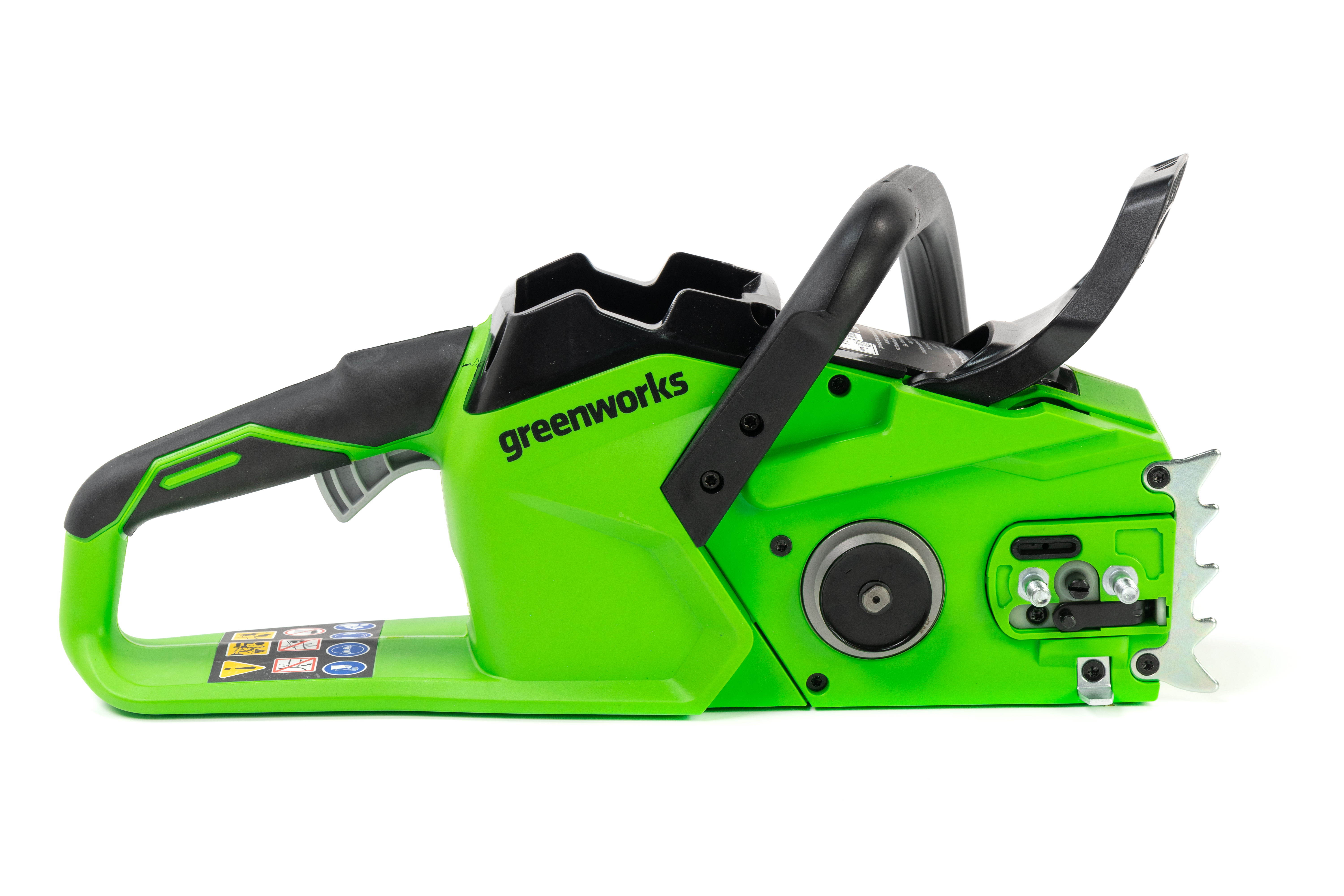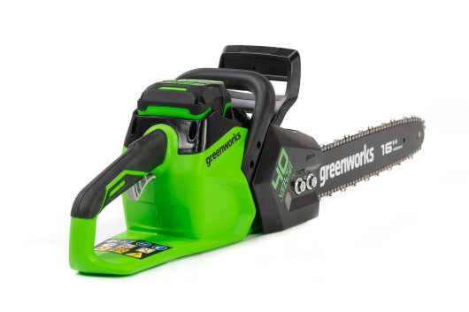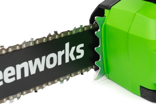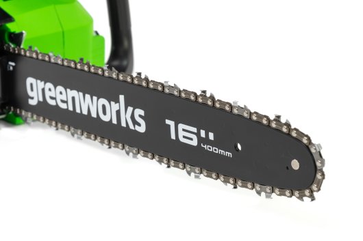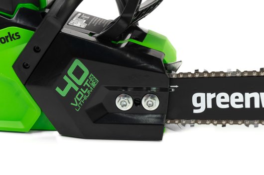 Цепная пила Greenworks GD40CS18 — отлично подойдет для полноценного ведения дачного хозяйства. Ее надежный бесщеточный двигатель сопоставим по мощности с бензиновыми аналогами на 1,5 л. с. При этом электродвигатель пилы Greenworks абсолютно экологичен, имеет высокий крутящий момент (пилит быстрее бензинового аналога), имеет низкий уровень шума и вибраций, а так же прост в эксплуатации потому, что не требует подготовки масло-бензиновой смеси и какого-либо обслуживания. Включение пилы производится одной кнопкой. Замена и установка цепи не требует инструмента.