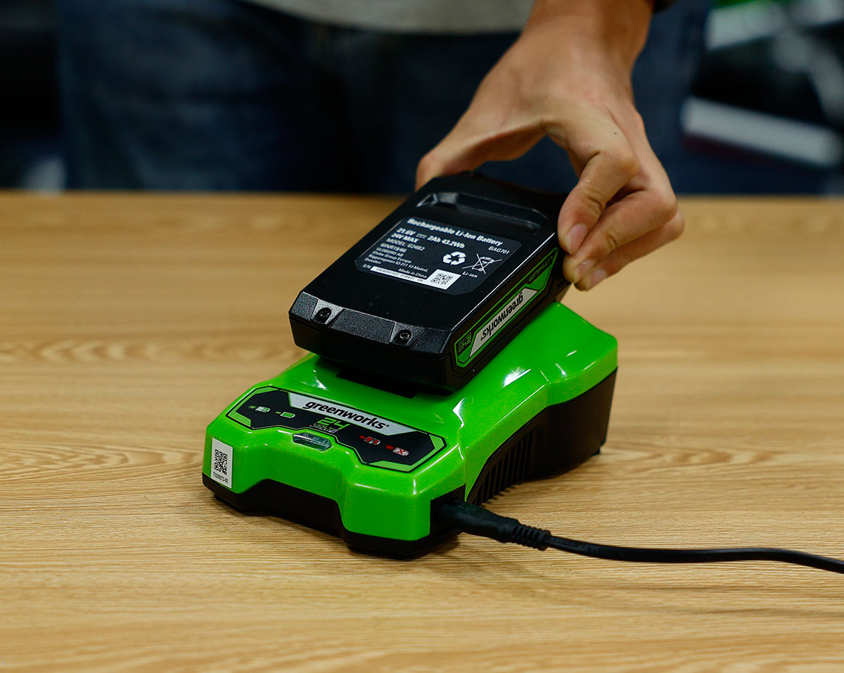 Зарядное устройство Greenworks G24C4 24V 4А 2946407 заряжает 2 Ач и 4 Ач аккумуляторы серии Greenworks 24V. Зарядка защищена от перегрева и перезаряда благодаря специальному защитному чипу. На ее корпусе находится индикатор заряда аккумулятора для удобного отслеживания. Устройство питается от сети 230 вольт переменного тока 50-60 Гц. Максимальный ток заряда — 4 А. Зарядка заряжает 2 Ач аккумулятор за 45 мин, 4 Ач — за 90 мин.