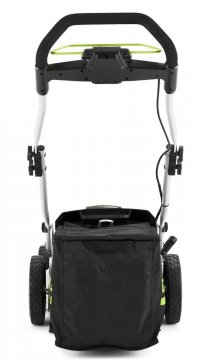 Высоту скашивания можно регулировать от 25 мм до 80 мм, со стальным приводом на все колеса. Важной системой является защита двигателя от механических повреждение, например при наезде на твердый предмет. Время автономной работы - до 600 м² от 5 А/ч батареи (АКБ и ЗУ не входит в комплект поставки). Для защиты от случайного включения предусмотрен специальный ключ безопасности и кнопка-предохранитель. Ручка газонокосилки складывается.