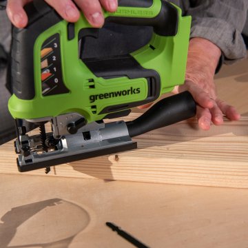 Электролобзик Greenworks GD24JS – это универсальный инструмент для отделочных и монтажных работ. Этот компактный аккумуляторный лобзик оснащен мощным бесщеточным двигателем, позволяющим быстро и аккуратно распиливать древесину толщиной до 100 мм. Классическая закрытая конструкция рукоятки обеспечивает привычный и комфортный хват для оптимального контроля в процессе работы. Корпус имеет нескользящее покрытие в местах удержания. В целях безопасности GD24JS оснащен выключателем с блокировкой случайного включения. Он совместим с любыми пильными полотнами с Т-образным креплением.