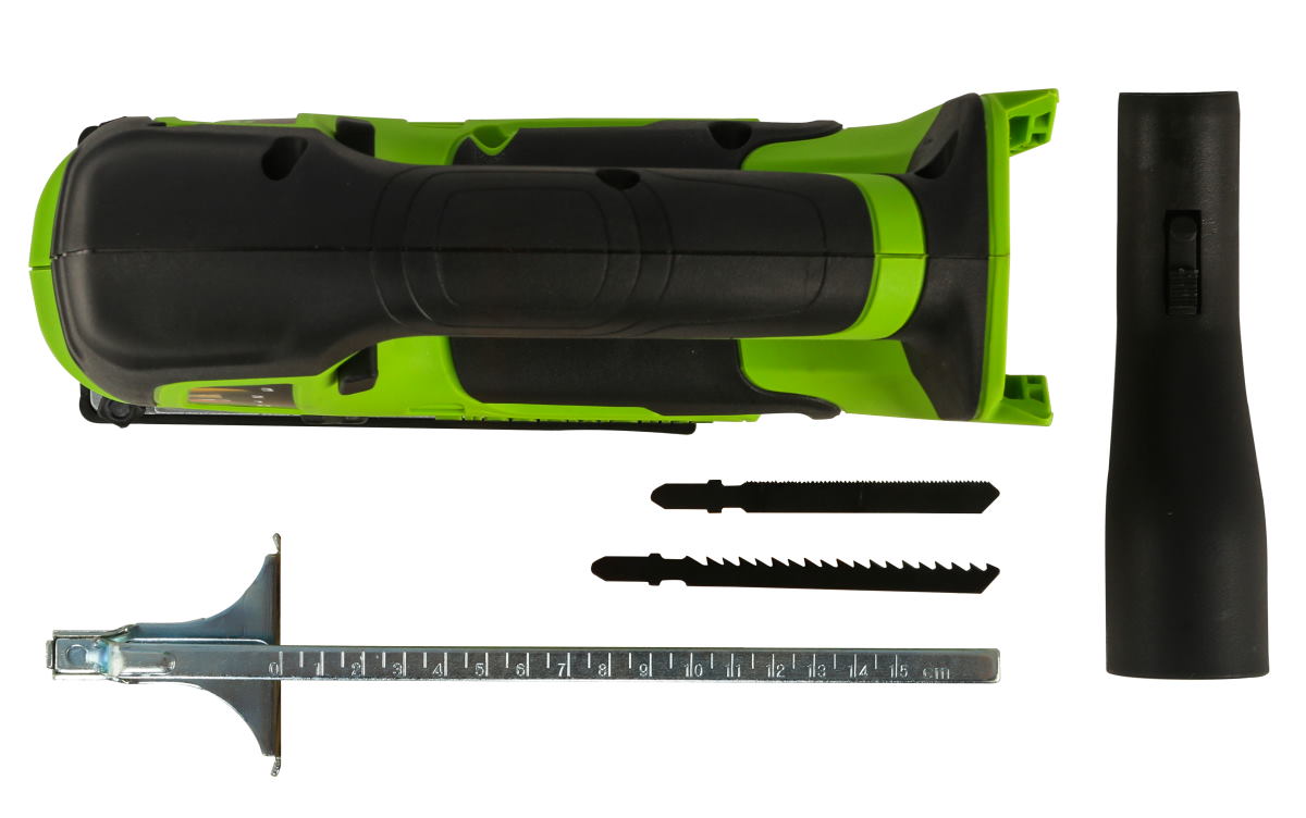 Регулировка скорости пиления — плавная, в диапазоне от 0 до 3000 ходов в минуту. Для защиты от порезов предусмотрен предохранитель. Для комфортной работы в плохо освещенных местах есть LED подсветка рабочей зоны. Рукоятка имеет удобную форму и прорезинена. Устройство оснащается системой защиты от случайного включения. Приятным дополнением является дополнительные полотна в количестве 2-х штук (в комплекте).