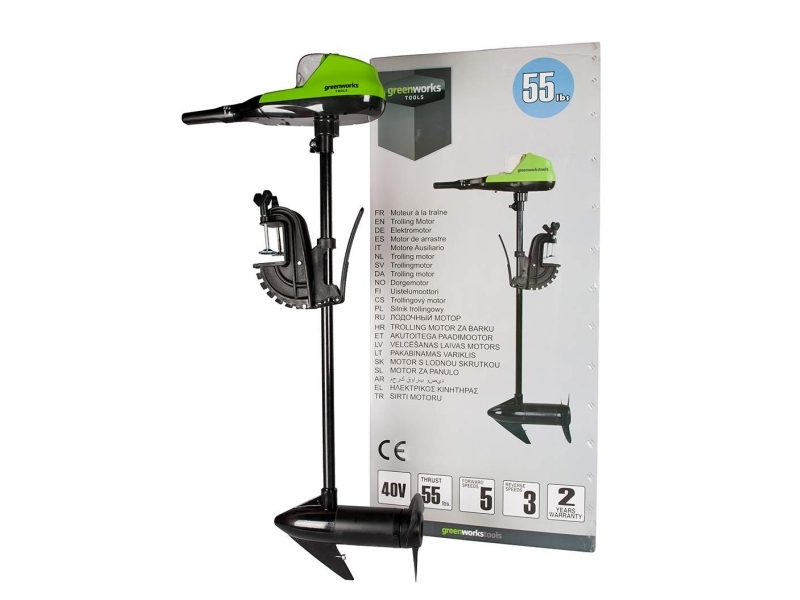 Лодочный мотор Greenworks G40TM55 40V — лодочный мотор из серии 40V для перемещения по водоему на небольшие расстояния до 1,3 км. Имеет тягу 25 кг и скорость до 4,83 км/ч. Управление производится телескопическим румпелем.