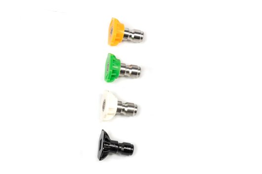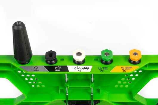 В комплект входят аксессуары для эффективной очистки любых поверхностей: усиленный профессиональный пистолет с металлической трубкой-удлинителем, ротационная насадка (турбо-фреза), 4 насадки с различными углами распыления: 15 градусов — для удаления грязи, плесени, краски; 25 градусов — универсальная насадка; 40 градусов — для деликатной мойки; насадка для моющего средства.