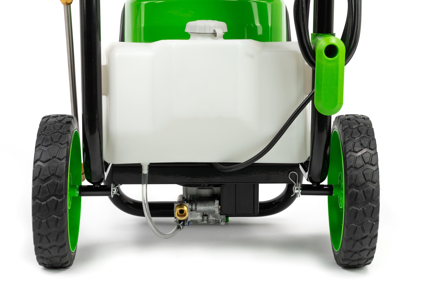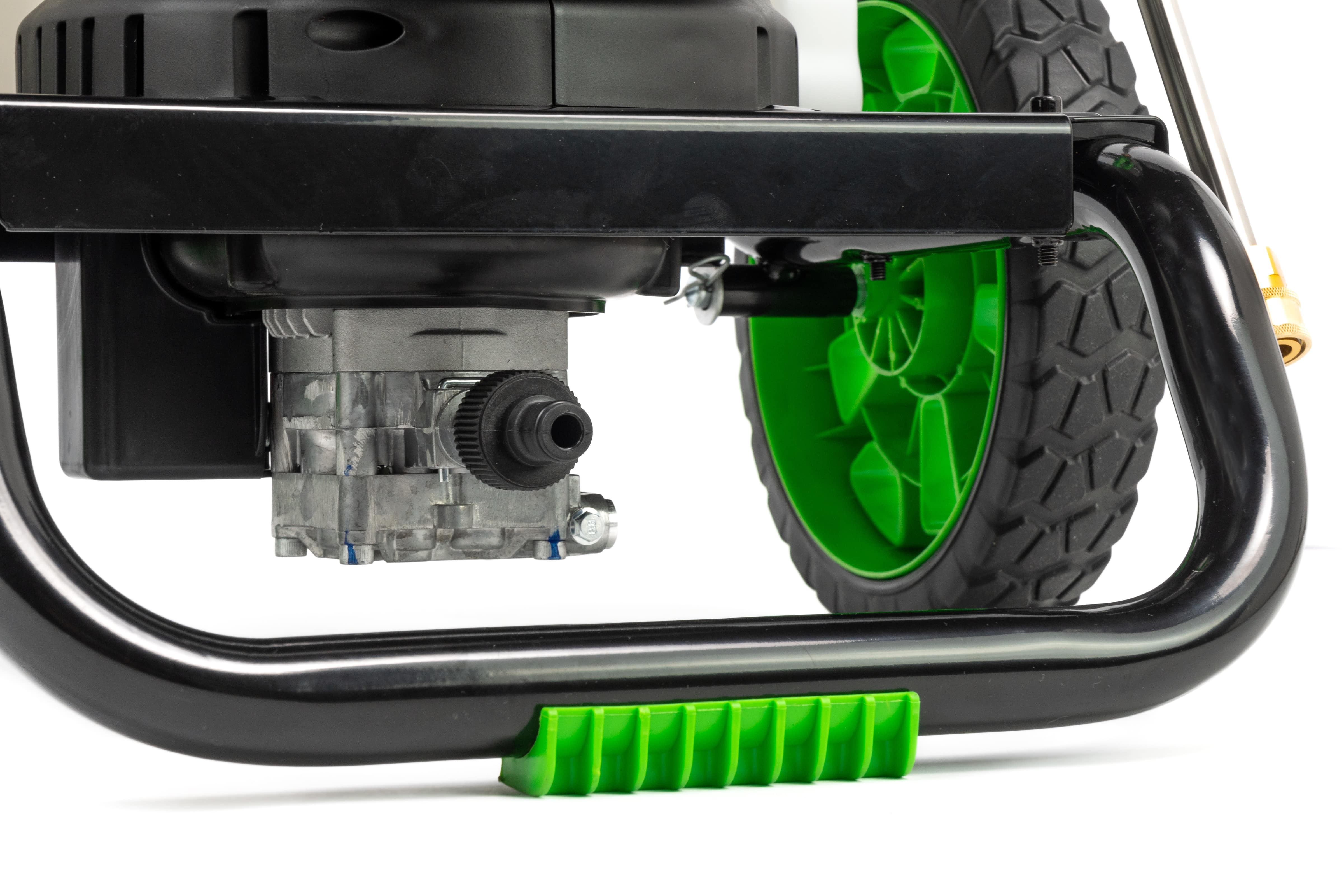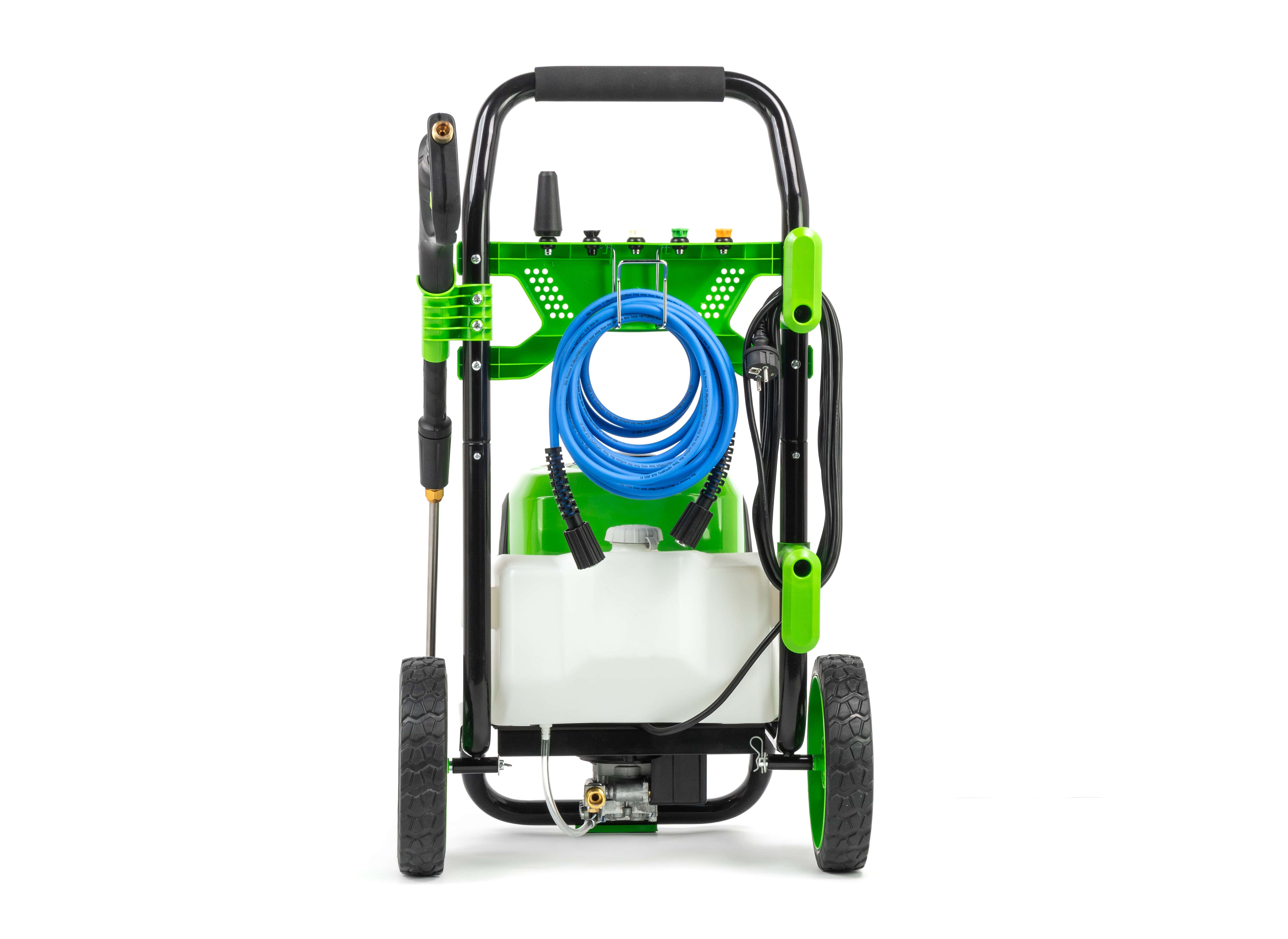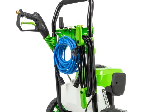 Резиновый шланг высокого давления длиной 7,6 м армирован стальной проволочной сеткой для максимальной прочности. Есть бак для моющего средства. Мойка высокого давления закреплена на прочной раме и имеет большие колеса для удобной транспортировки устройства. Насадки, шланг и электрический кабель закрепляются на ручке рамы, поэтому всегда находятся под рукой.