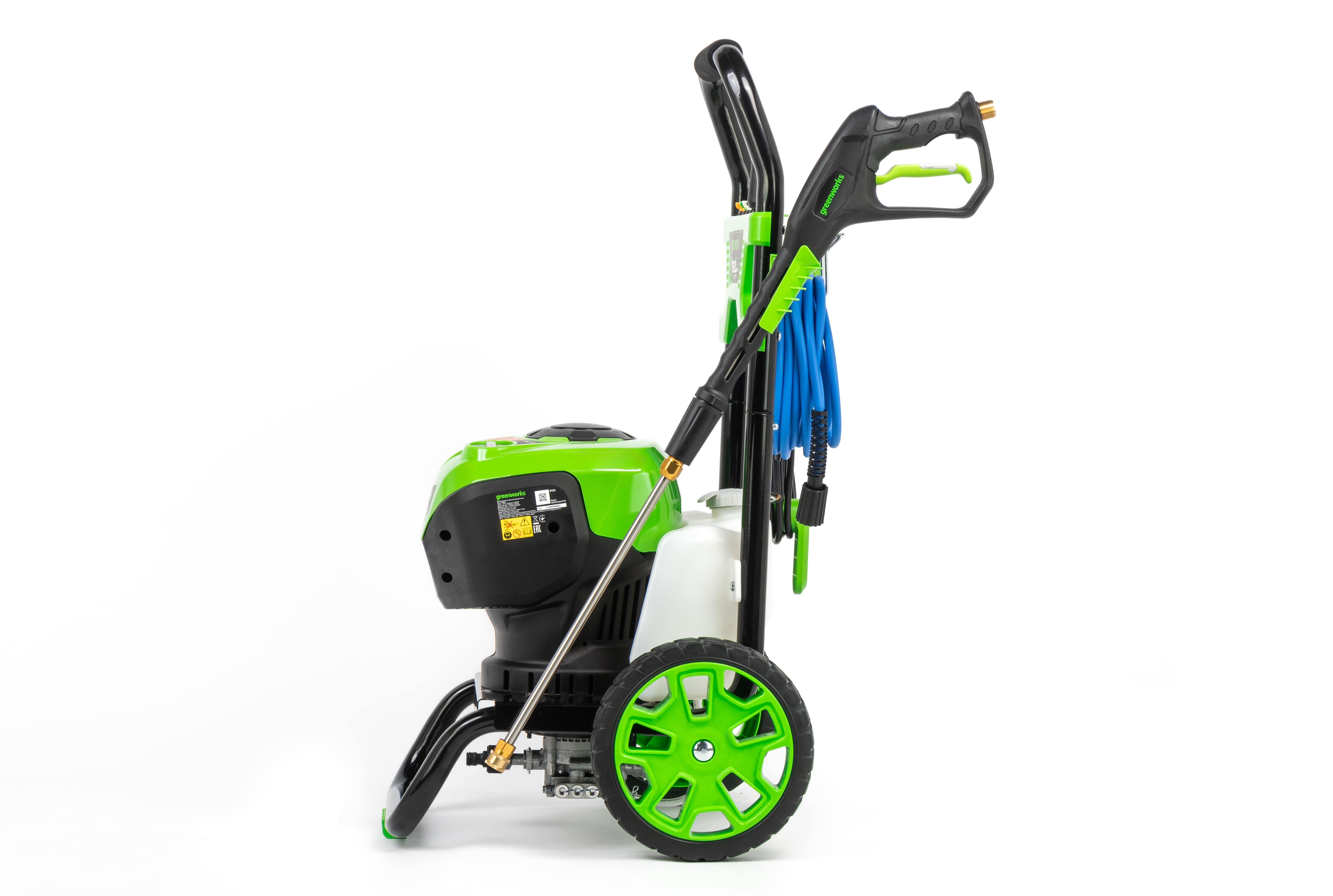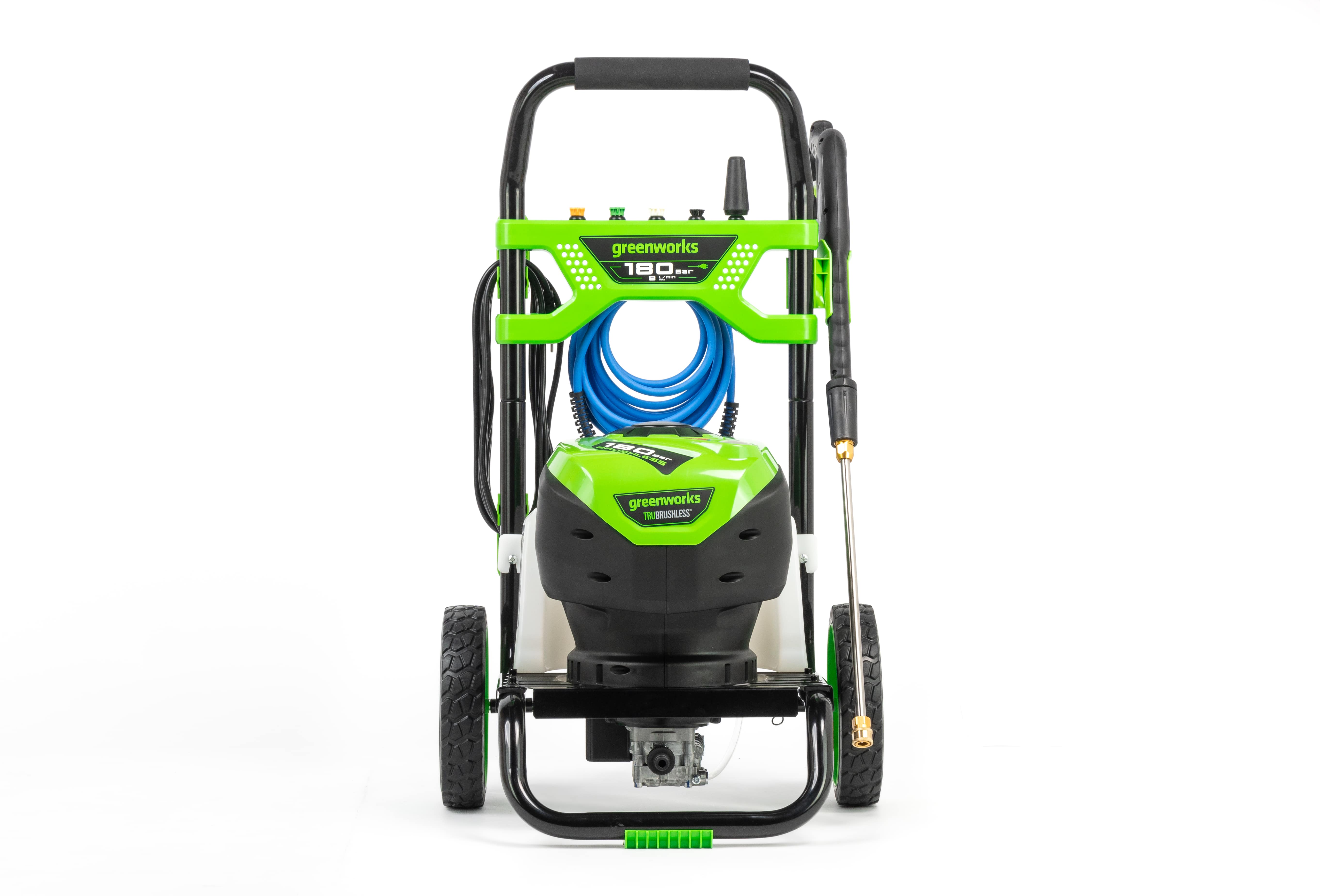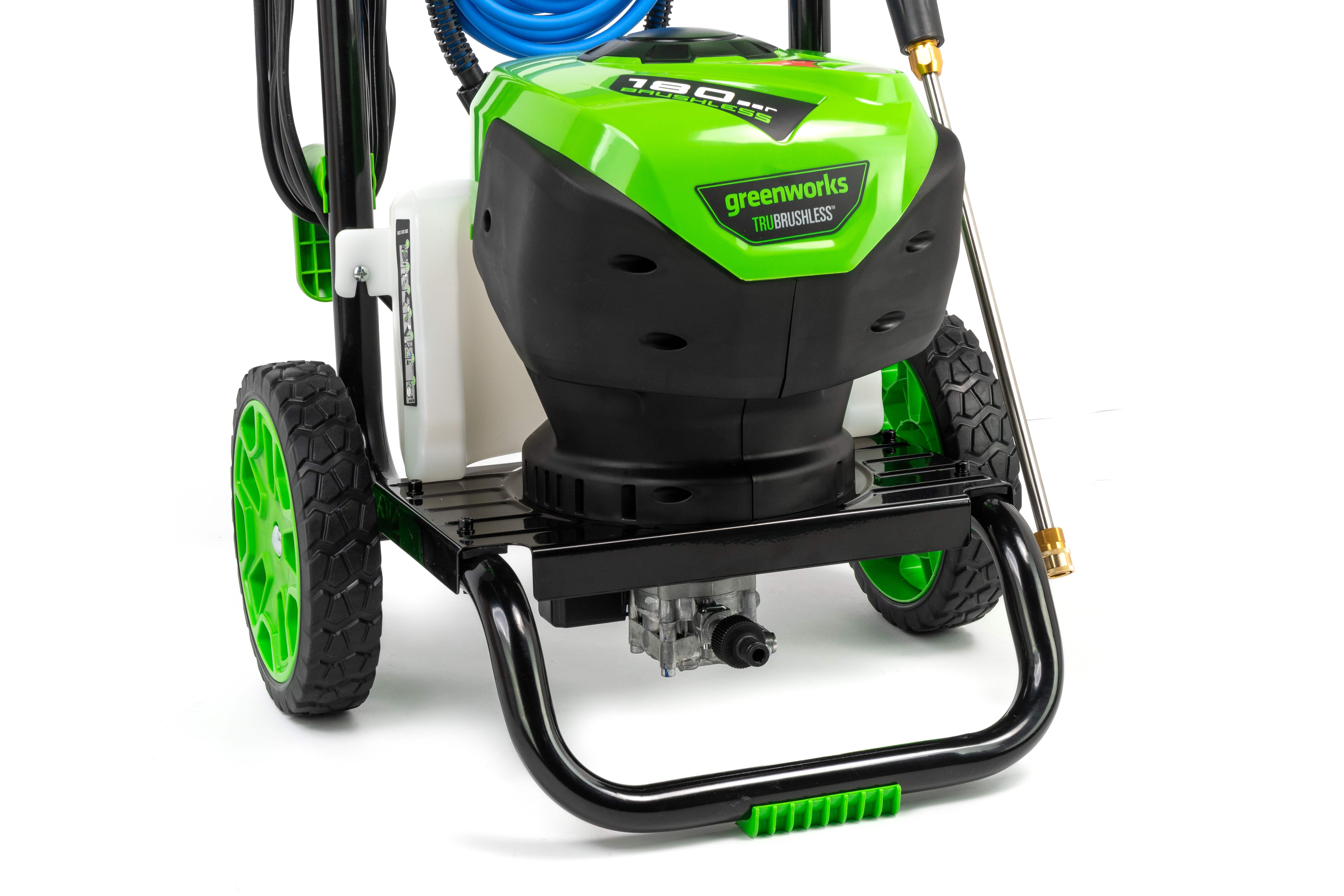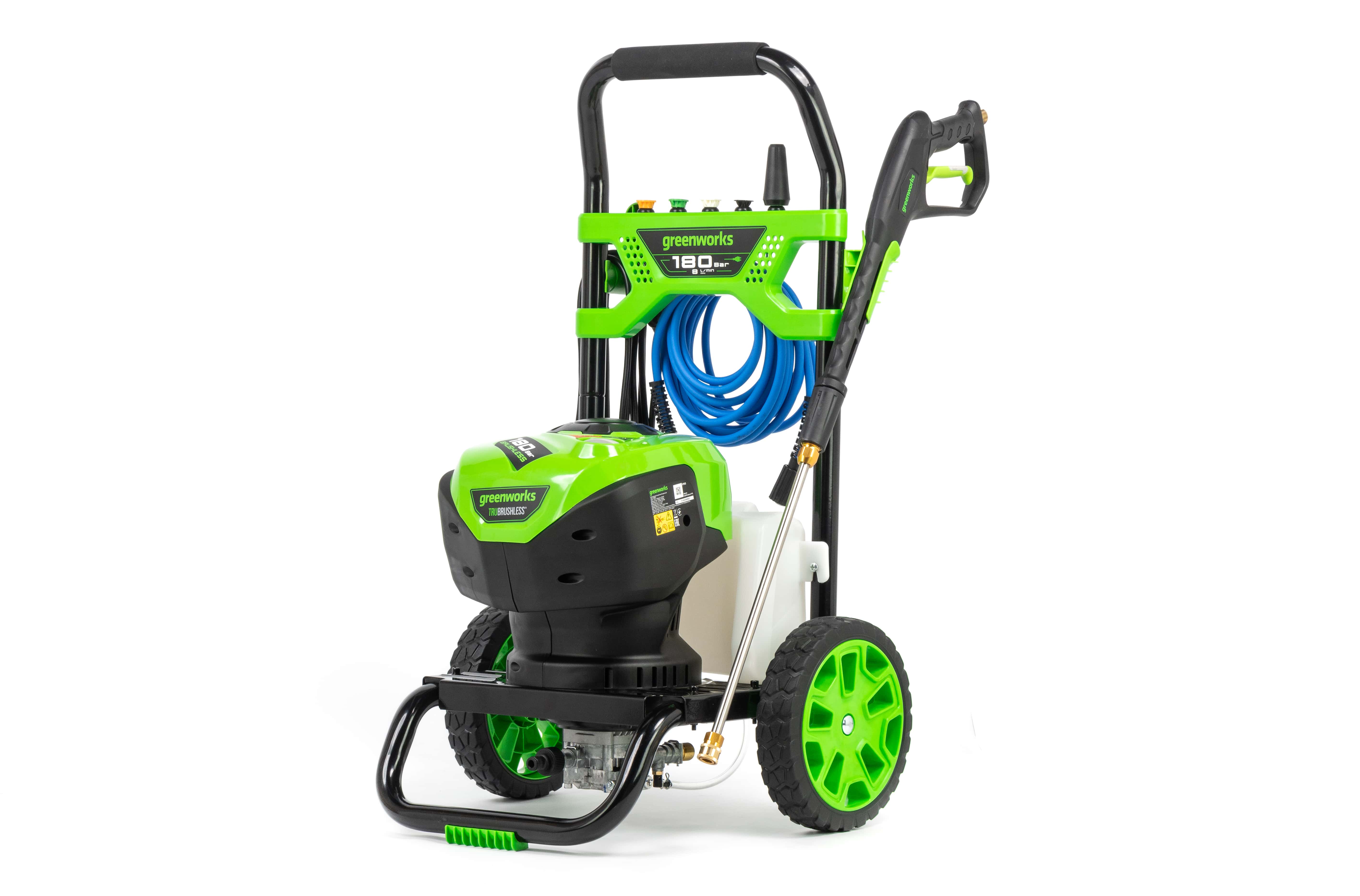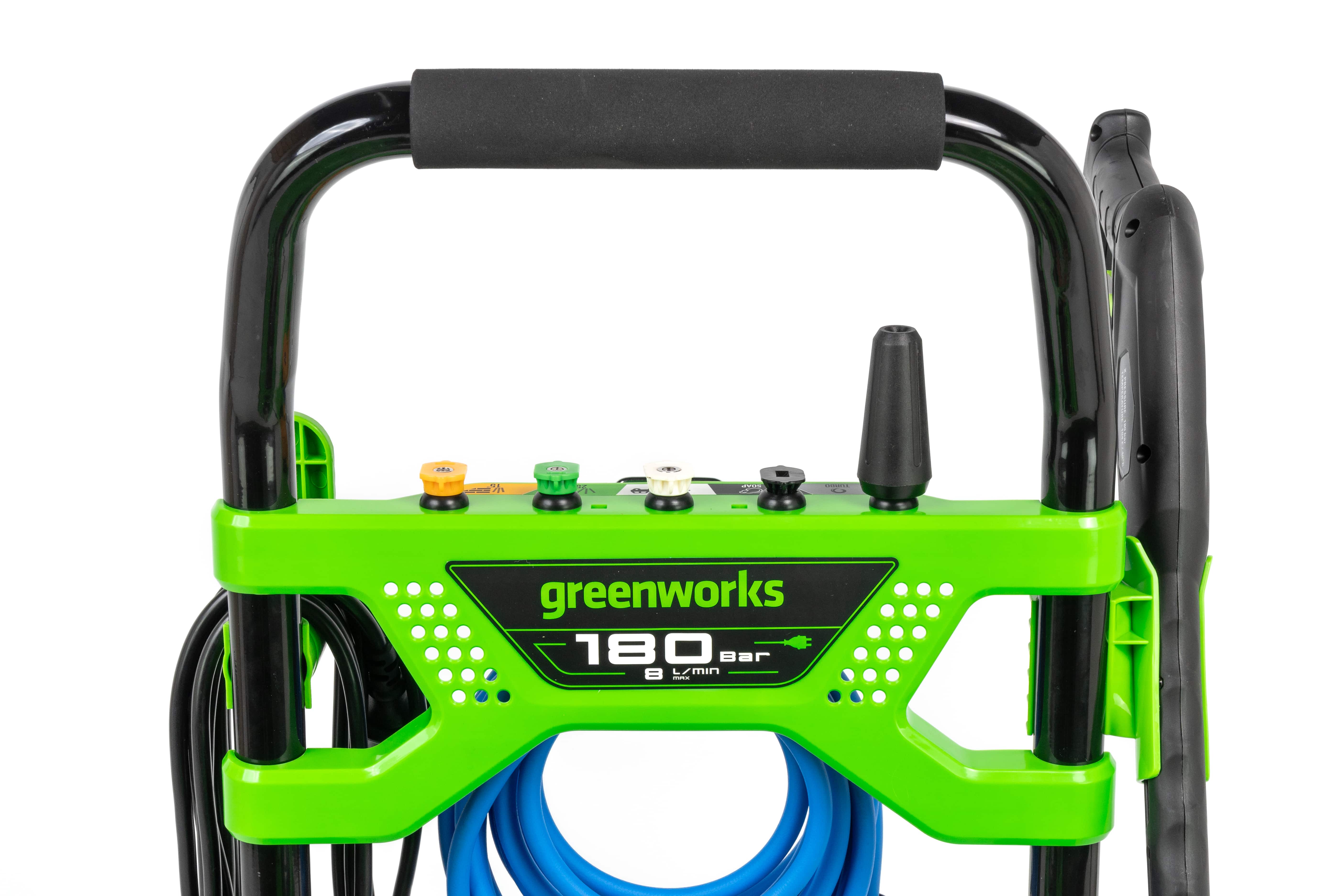 Мойка высокого давления Greenworks 5106007 (180 бар) бесщеточная электрическая — мойка из серии 230V с давлением до 180 бар и производительностью до 660 л/ч для мойки транспортных средств, садового инвентаря, дорожек и придомовых участков. Оснащена бесщеточным двигателем.