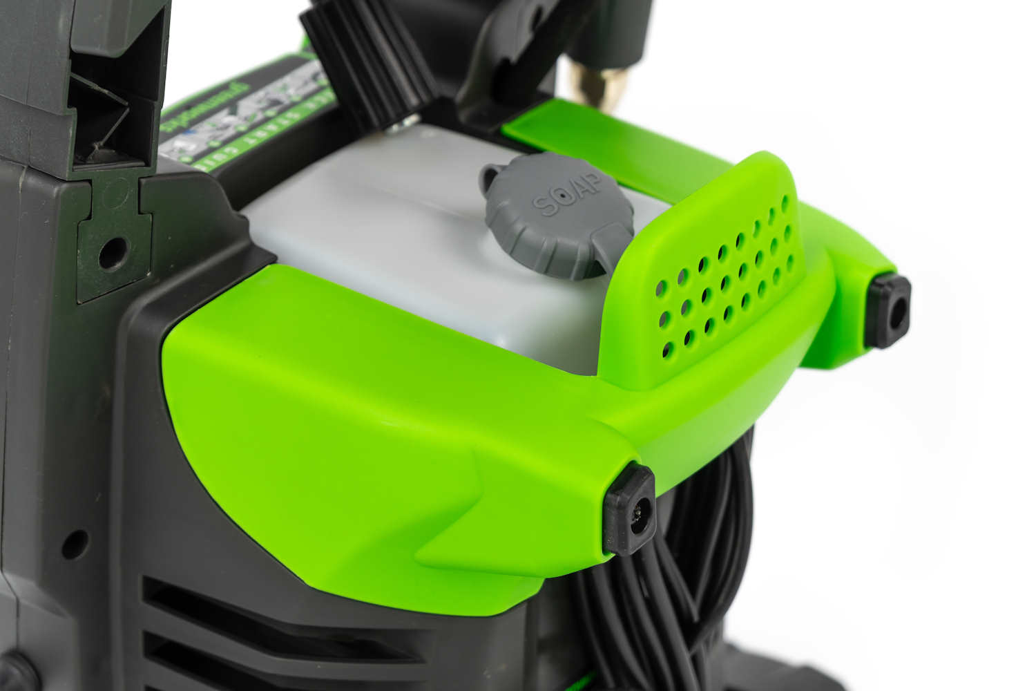 Мойка имеет компактные размеры и небольшой вес для комфортной транспортировки во время и после использования. Цилиндр помпы сделан из алюминия, а поршень из нержавеющей стали, что повышает надежность и продлевает срок службы устройства. Для удобного хранения оснастки на корпусе предусмотрен барабан для наматывания шланга, а сбоку корпуса можно хранить пистолет-распылитель. Также присутствует бачок для моющего средства.