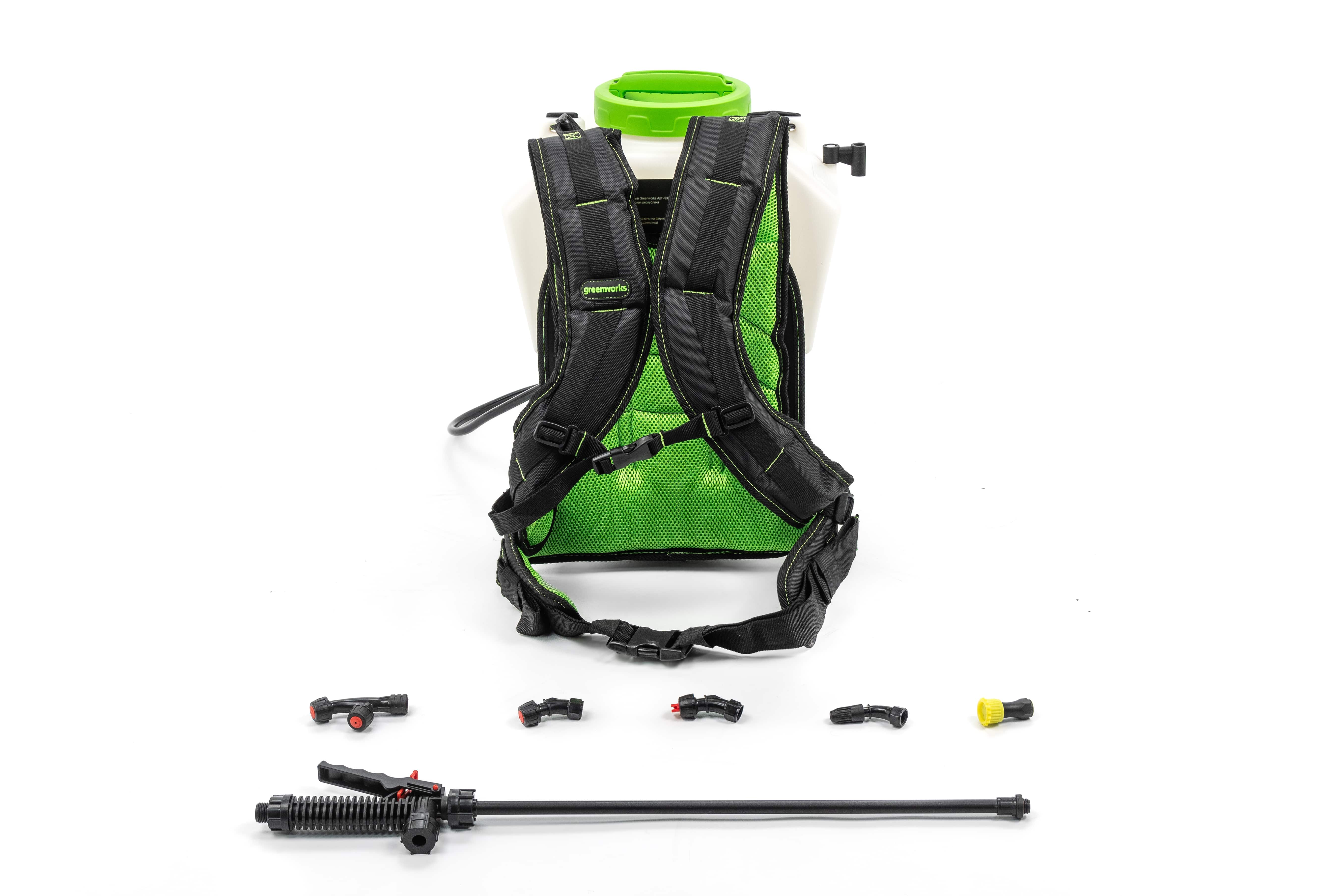 Аккумуляторный садовый опрыскиватель Greenworks G40BPS 40V 5300007 упрощает полив растений и опрыскивание огорода. Бак объемом 15 л оборудован эргономичными лямками, что позволит носить его как рюкзак. Максимальная производительность составляет 1,9 л/мин, которую обеспечивает электродвигатель. Длина рукоятки удлинителя — 72 см. Устройство имеет насос мембранного типа. В комплект идут различные насадки 5 шт.