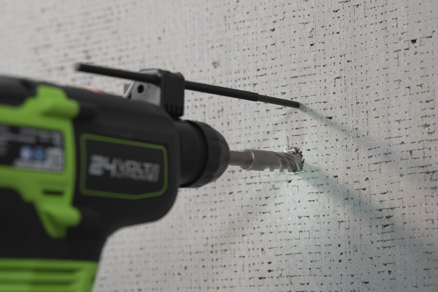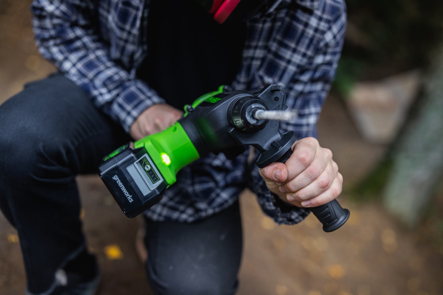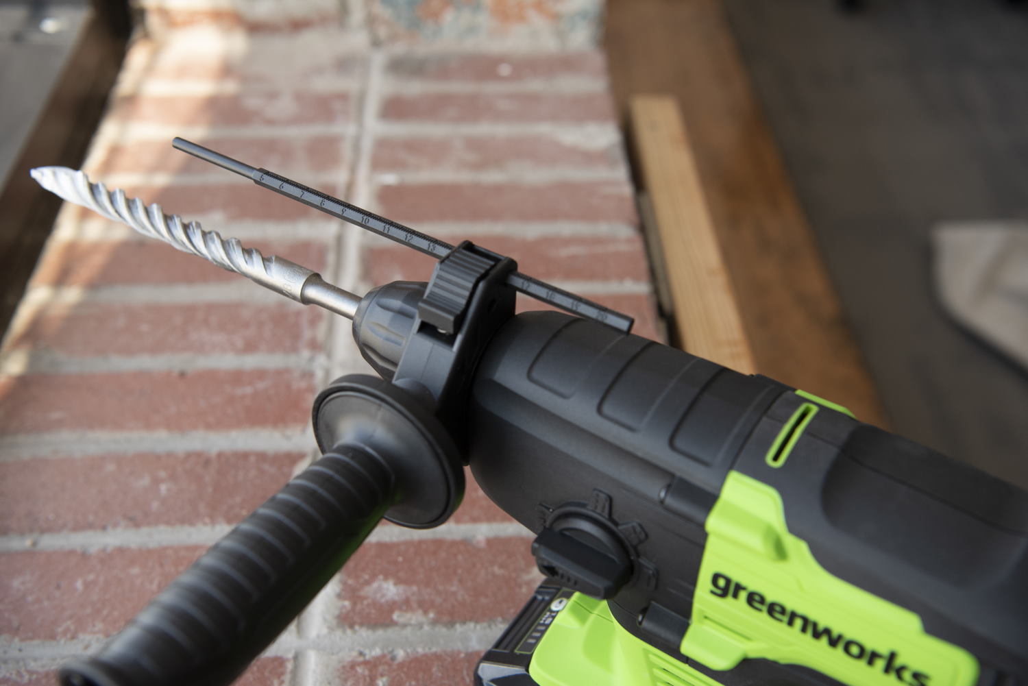 Перфоратор Greenworks GD24SDS2 оснащен самым популярным патроном — SDS-Plus. Сила удара 2 Дж и работа в режиме сверления и сверления с ударом позволяет делать отверстия в дереве до 38 мм, цементе до 24 мм, стали до 13 мм. А LED подсветка поможет работать в сложных удаленных местах или при недостаточном освещении.